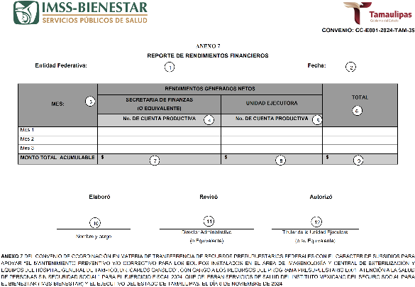 Nota: La Unidad Ejecutora deberá de presentar de manera mensual el registro y control del Formato "Reporte de Rendimientos Financieros" ante el administrador del contrato, acompañado de los estados de cuenta bancarios de la Secretaría de Finanzas (o su equivalente) y de la Unidad Ejecutora.