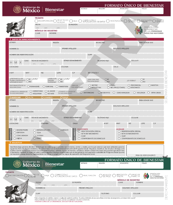 Cualquier trámite relacionado con la pensión por parte de la persona derechohabiente o de su persona adulta auxiliar, deberá realizarse a través del Formato Único de Bienestar (Anexo 2 de las presentes Reglas de Operación), acompañado de la documentación requerida de acuerdo con lo establecido en el numeral 3.3.2 de las mismas Reglas. Los trámites podrán realizarse durante cualquier momento del ejercicio fiscal.