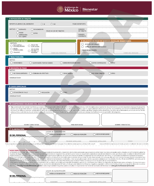 | Todas las Personas Adultas Mayores solicitantes de 65 años o más de edad Requisitos: 1. Acta de Nacimiento. 2. Documento de Identificación vigente: - Credencial para votar. - En caso de no contar con este documento, puede presentar pasaporte vigente o credencial del Instituto Nacional de las Personas Adultas Mayores (INAPAM), u otros documentos que acrediten identidad expedidos por la autoridad correspondiente. 3. Clave Única de Registro de Población (CURP). 4. Comprobante de domicilio (máximo 6 meses de antigüedad) o constancia de residencia de la autoridad local. 5. Formato Único de Bienestar debidamente llenado (Anexo 2 de las presentes Reglas de Operación). Persona Adulta Auxiliar Requisitos: 1. Documento de Identificación vigente: - Credencial para votar. - En caso de no contar con este documento, puede presentar pasaporte vigente o credencial del Instituto Nacional de las Personas Adultas Mayores (INAPAM), u otros documentos que acrediten identidad expedidos por la autoridad correspondiente. 2. Clave Única de Registro de Población (CURP). 3. Comprobante de domicilio (máximo 6 meses de antigüedad) o constancia de residencia de la autoridad local. 4. Formato Único de Bienestar debidamente llenado (Anexo 2 de las presentes Reglas de Operación). |