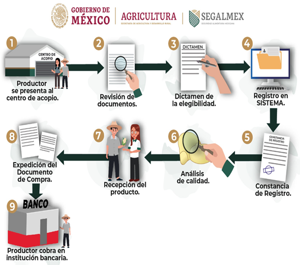 V. Centro de Acopio: espacio en donde se reciben granos como maíz y frijol, así como leche fresca. Además, se supervisa el cumplimiento de las normas de calidad vigentes, entre ellas, las especificadas en el artículo 24, fracción I, inciso f (para el caso de pequeños productores de maíz y frijol) y se otorga el Precio de Garantía.