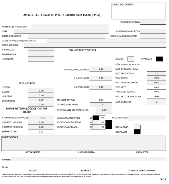 ANEXO 4. CERTIFICADO DE PESO Y CALIDAD DE FRIJOL (CPC-2)