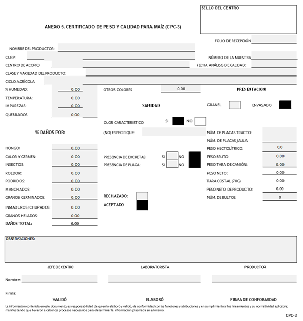 ANEXO 5. CERTIFICADO DE PESO Y CALIDAD DE MAÍZ (CPC-3)