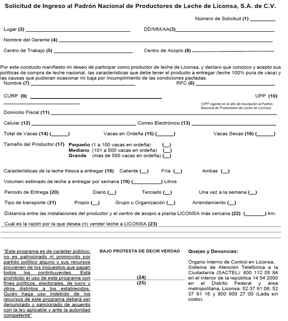 1. Se anotará el número de folio consecutivo que corresponda a la Solicitud de Ingreso al Padrón Nacional de Productores de Leche. Este campo será llenado por el personal de Liconsa. 2. Lugar en donde se realiza la solicitud.