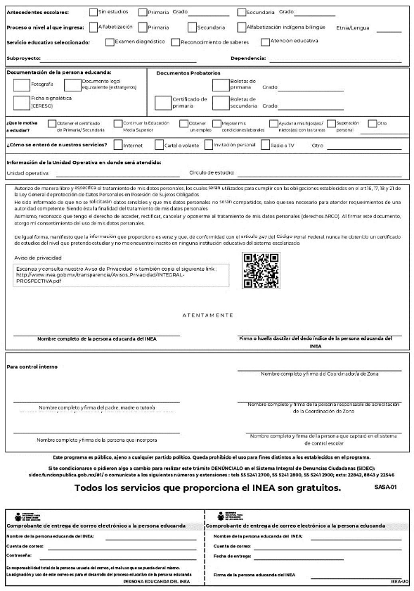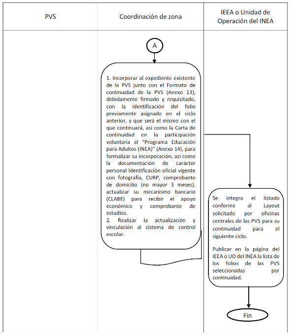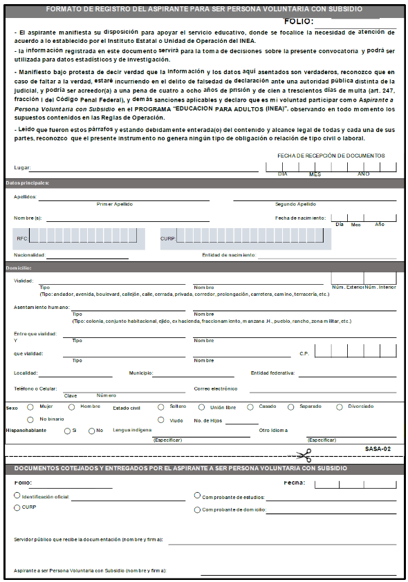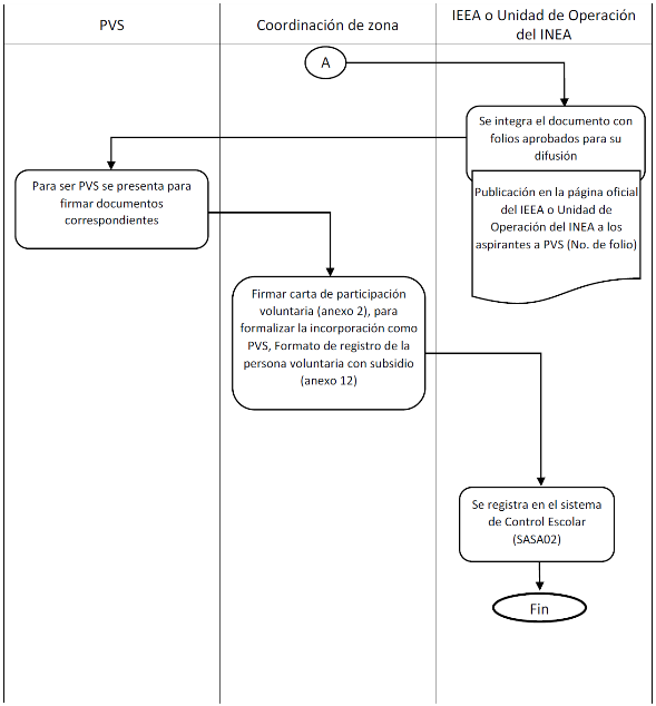 | 1. Recibir e incorporar al expediente, el Formato de Registro de la Persona Voluntaria con Subsidio (Anexo 12) debidamente firmado y requisitado, así como la carta de participación voluntaria al Programa "Educación para Adultos (INEA)" (Anexo 2), para formalizar su incorporación como PVS. | Los IEEA, UO del INEA y Coordinaciones de zona. | Oficinas del IEEA y/o UO y Coordinaciones de Zona en el estado de...........................ubicadas ..................... |