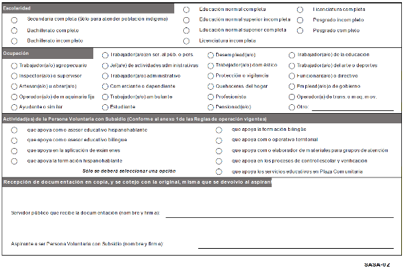 La/el de nombre _____________________, (Persona Voluntaria con Subsidio), reconozco que derivado del apoyo voluntario brindado a los servicios educativos que presto al ______________________, no se genera ningún tipo de subordinación y/o poder jurídico de mando entre las partes, siendo mi voluntad prestar el apoyo con total libertad atendiendo a lo previsto en las Reglas de Operación vigentes.