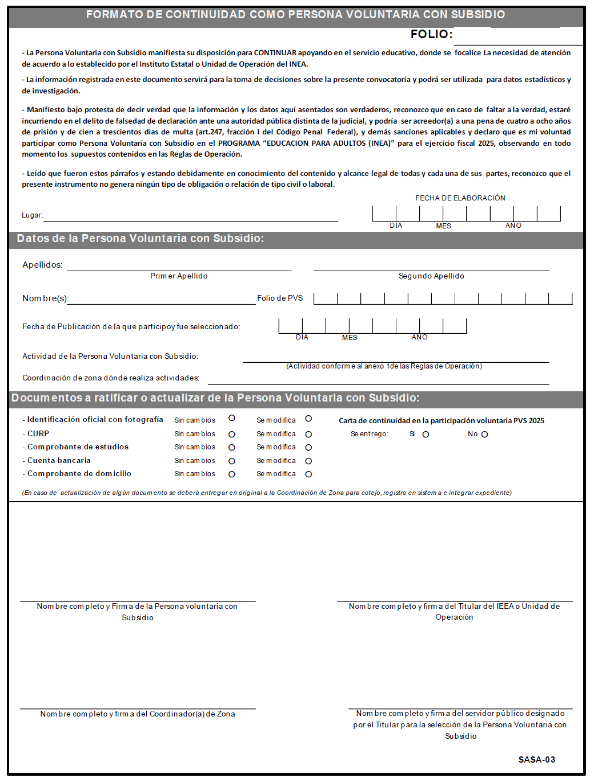 Por medio de la presente, yo la/el C._______________________________, a partir de esta fecha, con domicilio en ________________________________________, código postal __________, Estado ____________________ manifiesto mi deseo de continuar participando como Persona Voluntaria con Subsidio en el "PROGRAMA EDUCACIÓN PARA ADULTOS (INEA) PARA EL EJERCICIO FISCAL 2025. Para lo cual, bajo protesta de decir verdad, manifiesto que conozco y acepto el contenido de la Reglas de Operación vigentes de dicho Programa, así como las disposiciones que lo regulan.