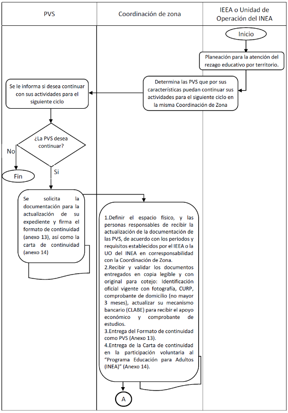 Dando cumplimiento a las necesidades propias de la operación, para que las PVS puedan continuar bajo la misma actividad y la Coordinación de Zona donde se desempeñó en el ciclo anterior, previa anuencia del Instituto Estatal y/o Unidad de Operación, sin necesidad de volver a realizar un proceso de convocatoria y cumpliendo los requisitos establecidos en las presentes reglas, conforme al siguiente proceso: