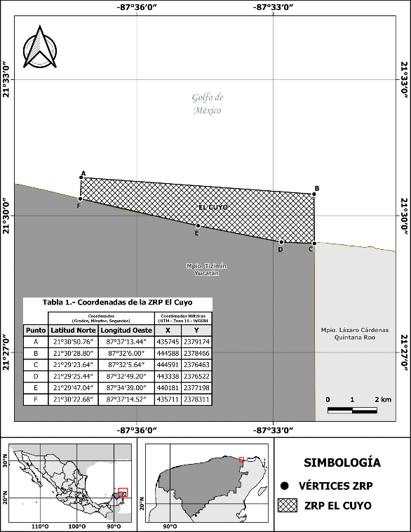 Figura. Delimitación y ubicación de la Zona de Refugio Pesquero Parcial Temporal en aguas marinas de jurisdicción federal, paralela a la línea de costa del poblado de El Cuyo, en el municipio de Tizimín, en el estado de Yucatán (el plano de ubicación contenido en el presente Acuerdo es con fines específicamente de referencia geográfica y sin valor cartográfico).