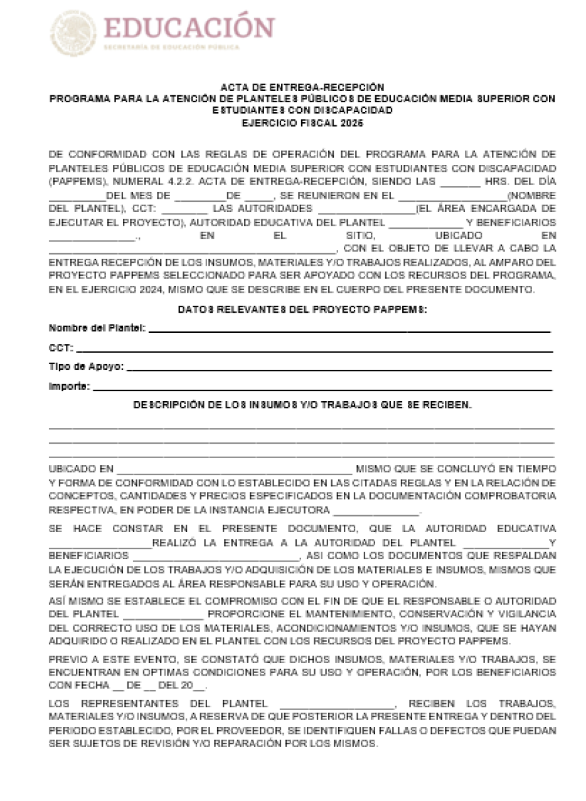 De conformidad con las Reglas de Operación del Programa Atención de Planteles Públicos de Educación Media Superior con estudiantes con discapacidad (PAPPEMS) publicadas en el Diario Oficial de la Federación para el ejercicio fiscal vigente, me permito informar a usted que el plantel (nombre) con CCT xxxxxx, localizado en el estado de (nombre de la Entidad Federativa) expresa su voluntad, interés y compromiso de participar en su gestión y desarrollo.