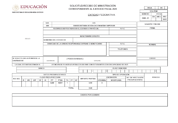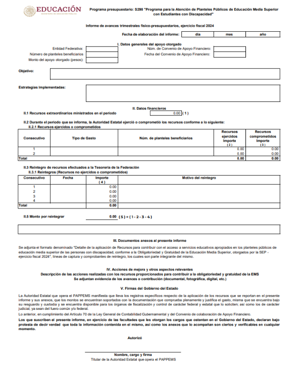 ANEXO QUE FORMA PARTE INTEGRANTE DEL CONVENIO DE COLABORACIÓN PARA LA OPERACIÓN DEL PROGRAMA ATENCIÓN DE PLANTELES PÚBLICOS DE EDUCACIÓN MEDIA SUPERIOR CON ESTUDIANTES CON DISCAPACIDAD PARA EL EJERCICIO FISCAL 2025, CELEBRADO ENTRE EL GOBIERNO FEDERAL, POR CONDUCTO DE LA SECRETARÍA DE EDUCACIÓN PÚBLICA, Y EL ESTADO LIBRE Y SOBERANO DE (NOMBRE DEL ESTADO), DE FECHA (DÍA) DE (MES) DE 2025.