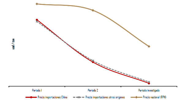 c. En el periodo analizado el precio promedio de las importaciones investigadas mostró una caída de 60% y registró niveles crecientes de subvaloración con respecto del precio de venta al mercado interno de la rama de producción nacional, a pesar de la depresión de precios que sufrió esta para poder competir. En efecto, el porcentaje de subvaloración fue de 12% en el periodo 1, 44% en el periodo 2 y 46% en el periodo investigado. Asimismo, se ubicó 1% por arriba del precio promedio de las importaciones de otros orígenes en el periodo 1 y 2% y 3% por debajo en los periodos 2 e investigado, respectivamente.