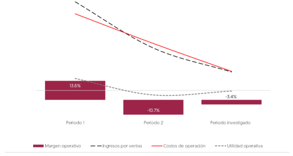 c. En consecuencia, el margen operativo bajó 24.3 puntos porcentuales en el periodo 2 y creció 7.3 puntos porcentuales en el periodo investigado, lo que reflejó una caída de 17 puntos porcentuales en el periodo analizado, al pasar de un margen operativo de 13.6% en el periodo 1 a -3.4% en el periodo investigado.