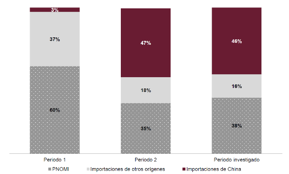 a. Las importaciones de otros orígenes perdieron 67 puntos de participación en las importaciones totales durante el periodo analizado derivado del incremento de las importaciones investigadas. Asimismo, su volumen se redujo 70% en el periodo analizado (disminuyeron 54% en el periodo 2 y 35% en el periodo investigado), de modo que perdieron 21 puntos porcentuales de participación de mercado y 2 puntos porcentuales en el periodo investigado.