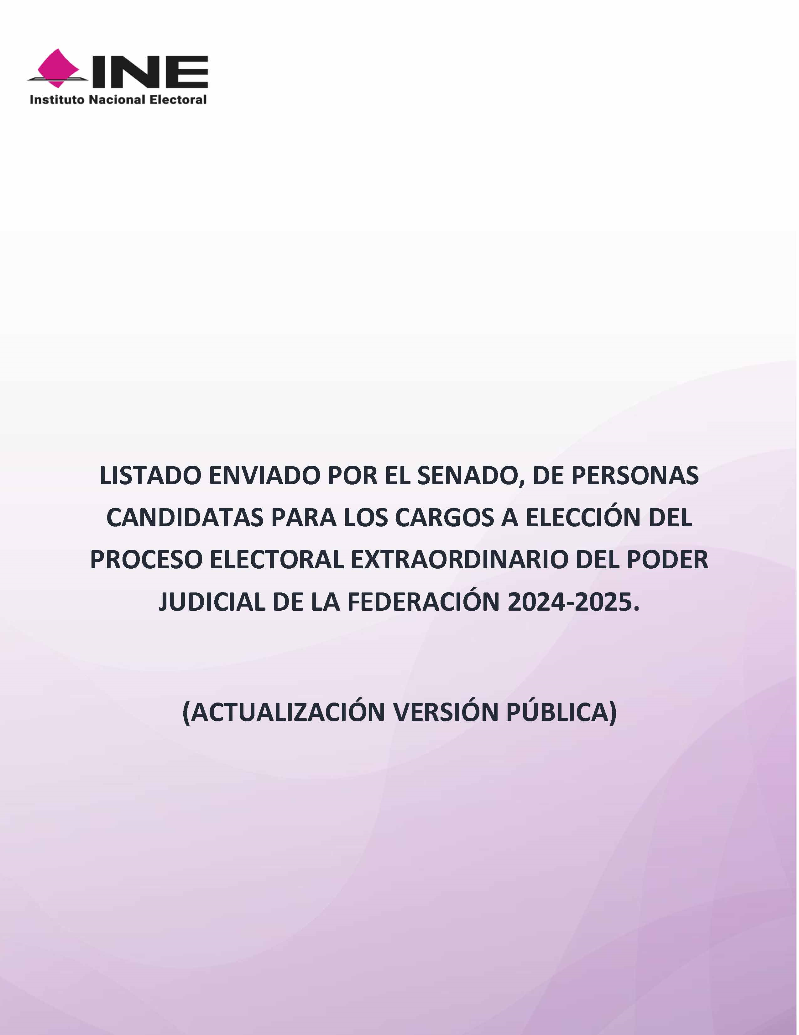Posteriormente, el 16 de febrero de 2025, mediante oficio INE/SE/176/2025, la Secretaría Ejecutiva, instruyó a la Unidad Técnica de Transparencia y Protección de Datos Personales que, para que sustituyera el Listado enviado por el Senado, de personas Candidatas para los Cargos a elección del Proceso Electoral Extraordinario del Poder Judicial de la Federación 2024-2025 (Versión Pública) derivado de la remisión efectuada por la Presidencia de la Mesa Directiva del Senado. Especificando la fecha y que se refiere a una versión pública actualizada, la cual se adjunta como Anexo 6.