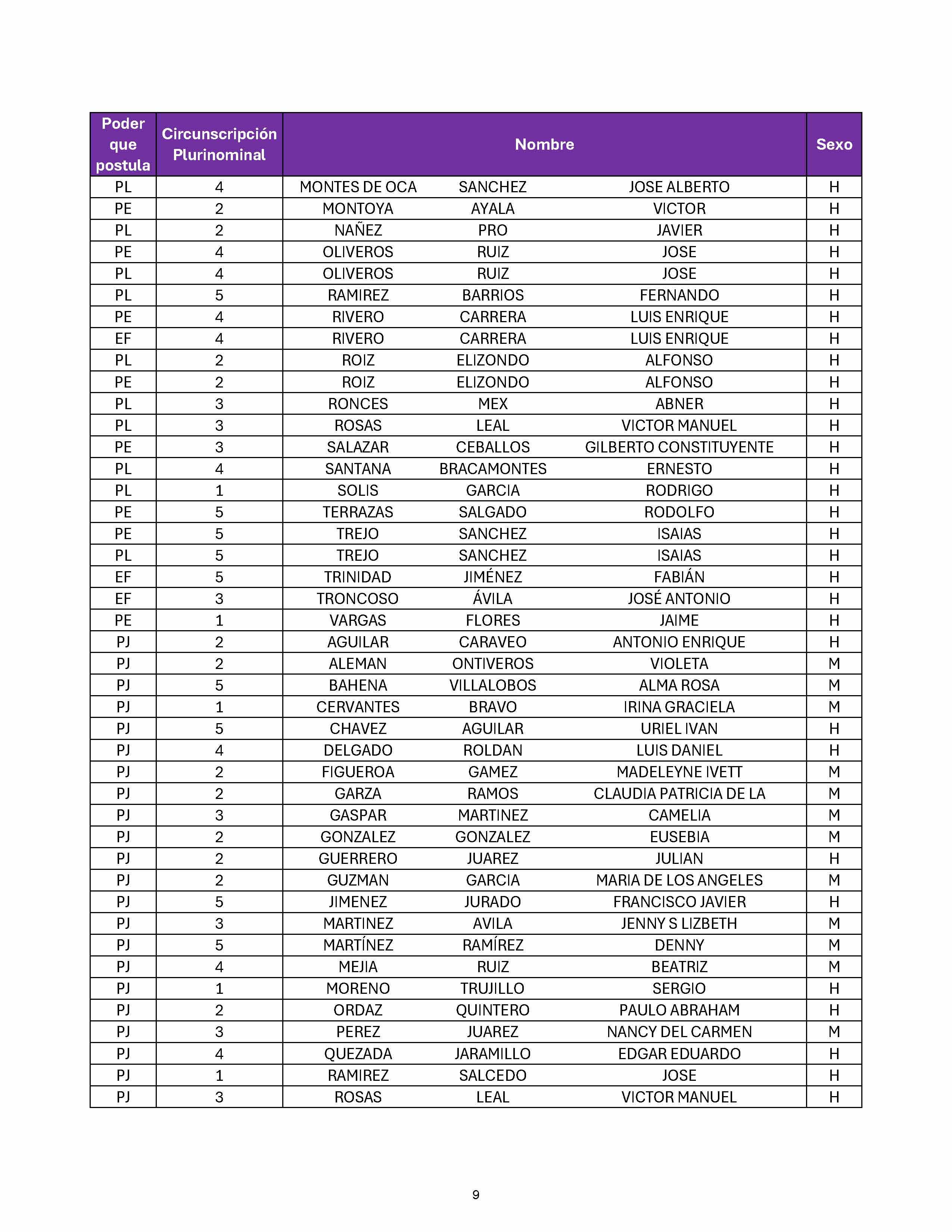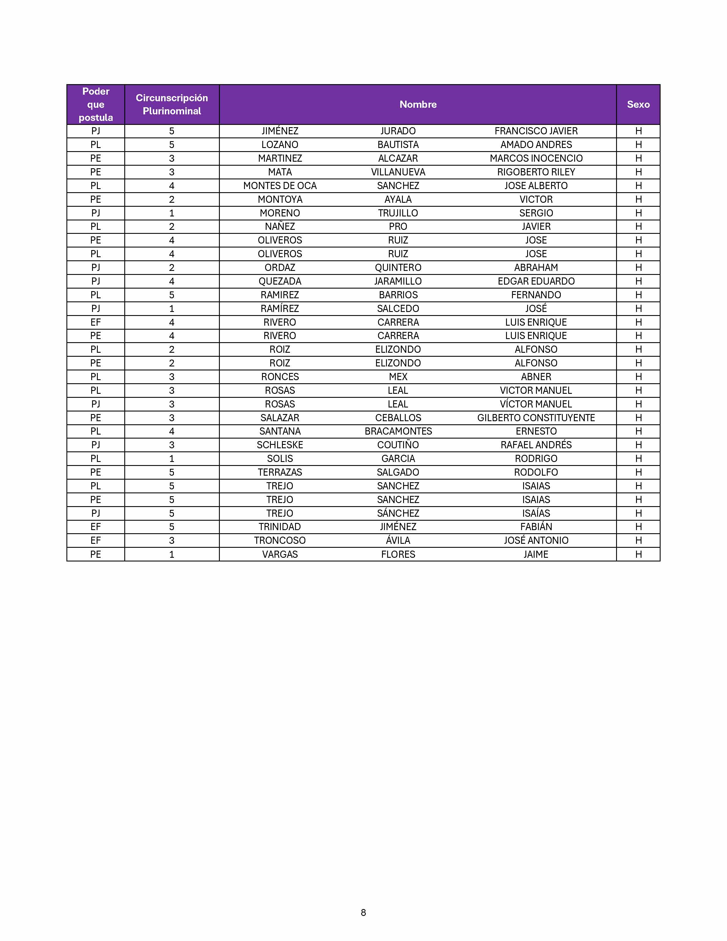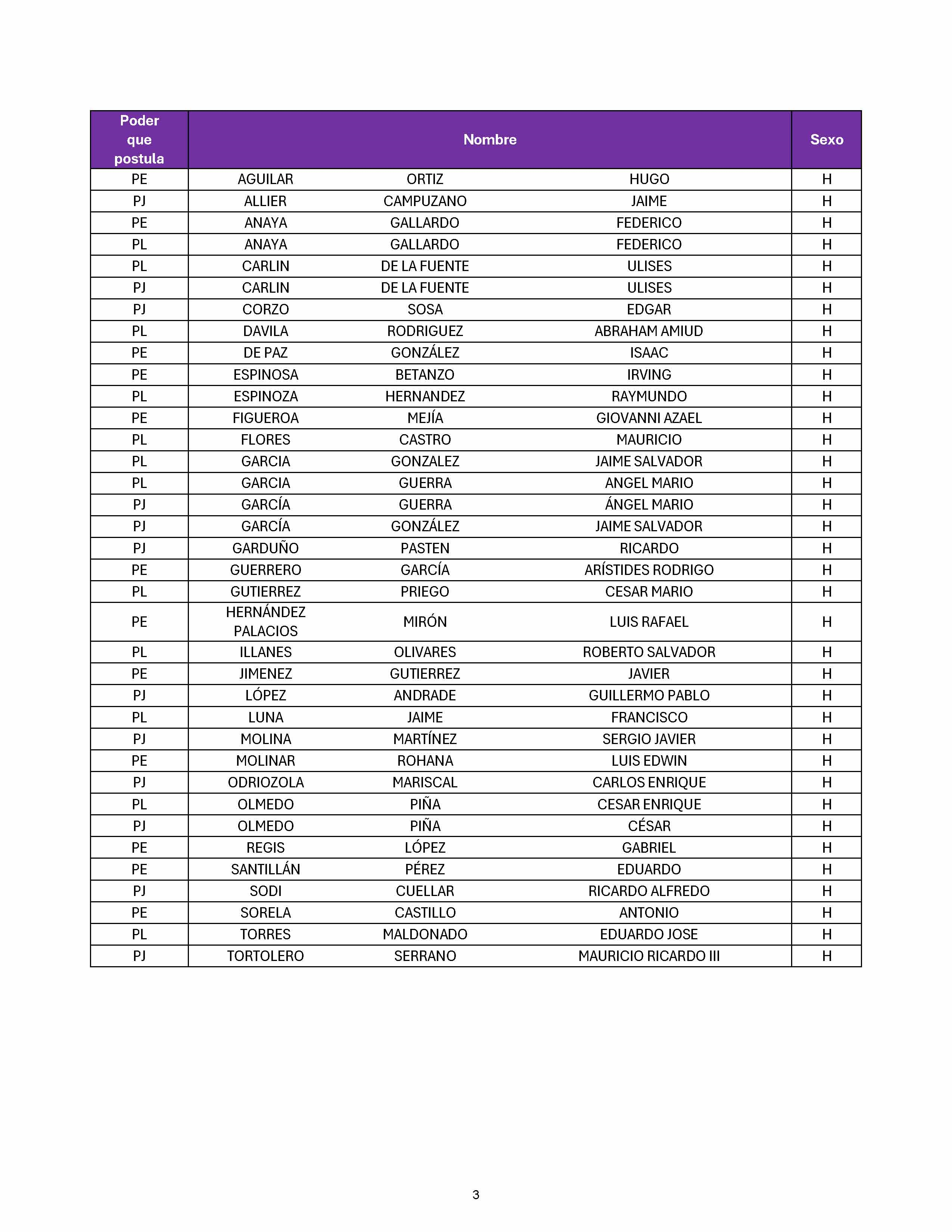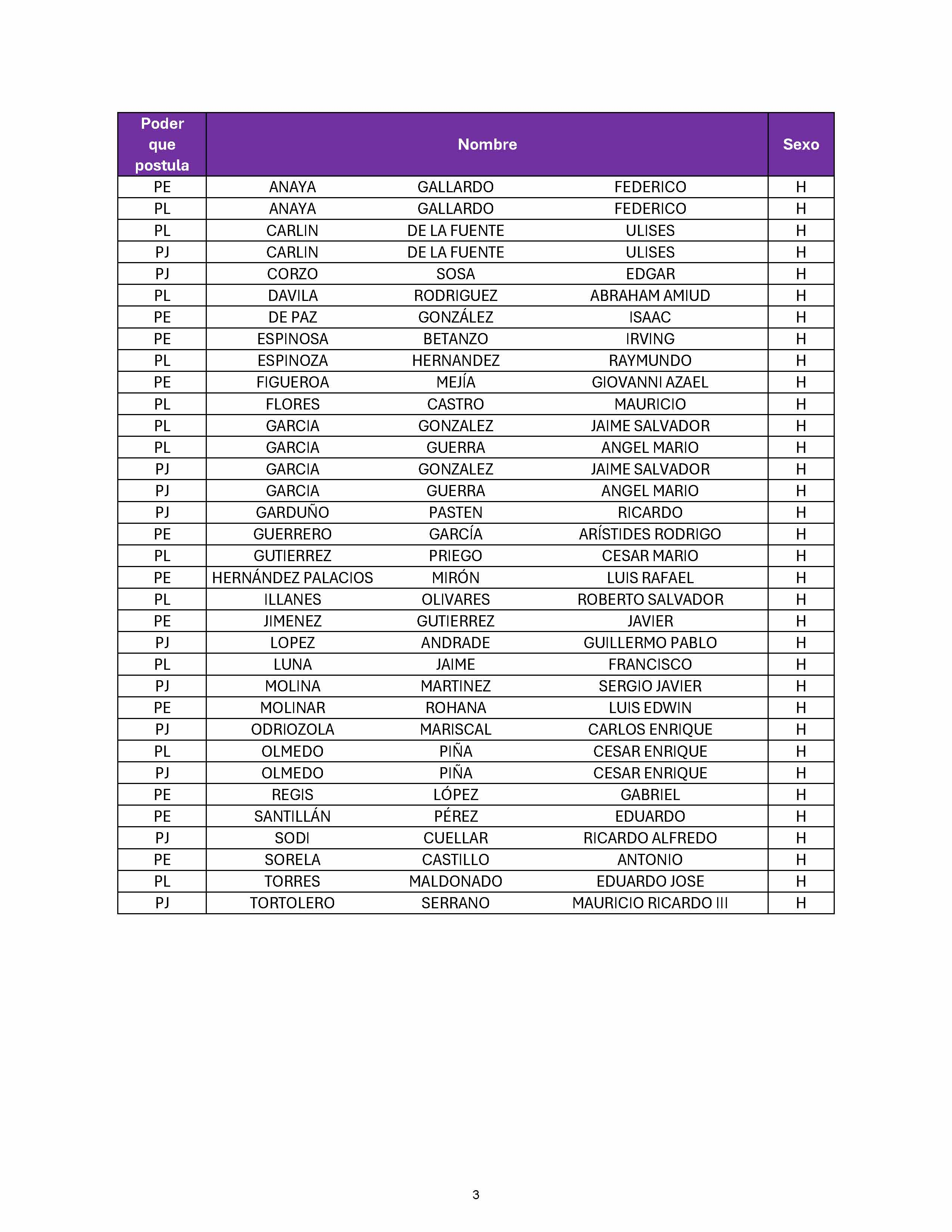 Adicionalmente, remitió la versión pública de los listados de candidaturas que se limita a los siguientes datos: categoría del cargo, Poder del Estado que postula, nombre de la persona candidata, y sexo, conforme a lo establecido en los artículos 3 y 74 de la Ley General de Transparencia y Acceso a la Información Pública.