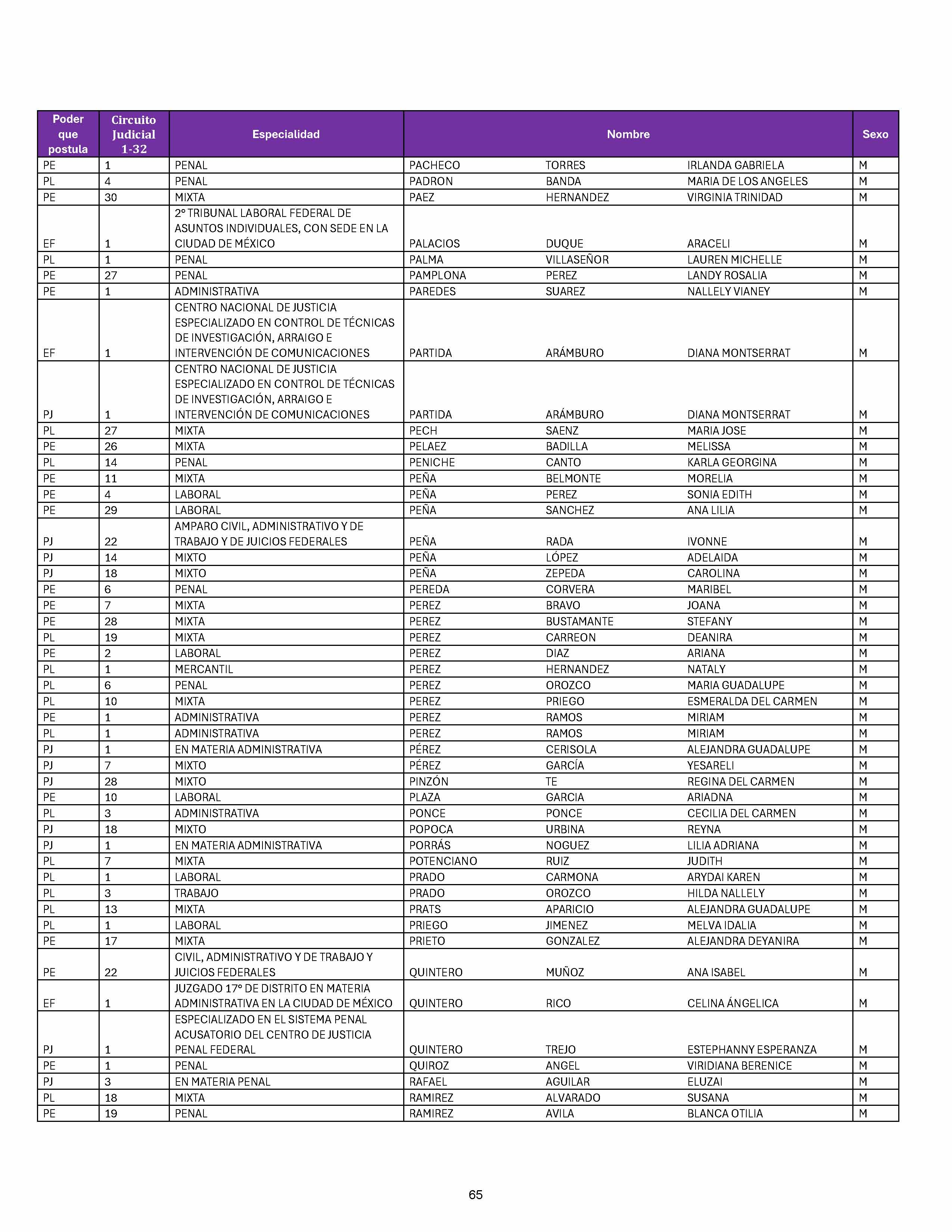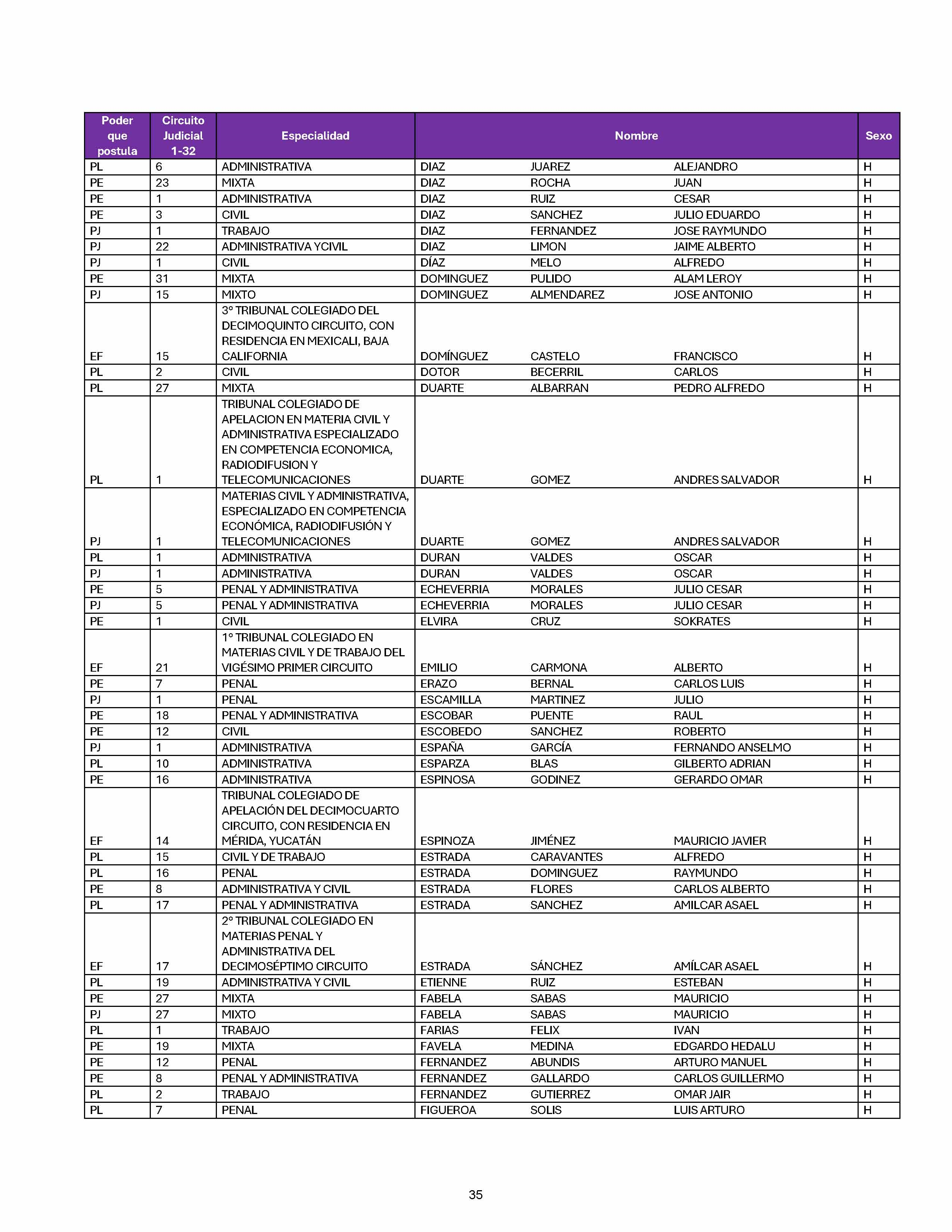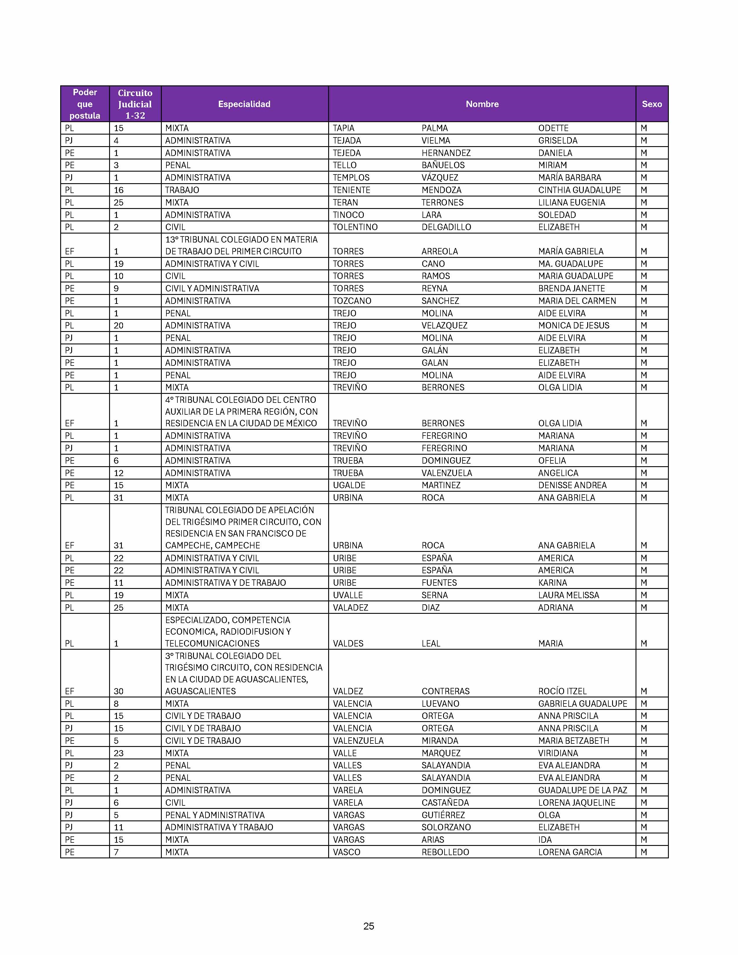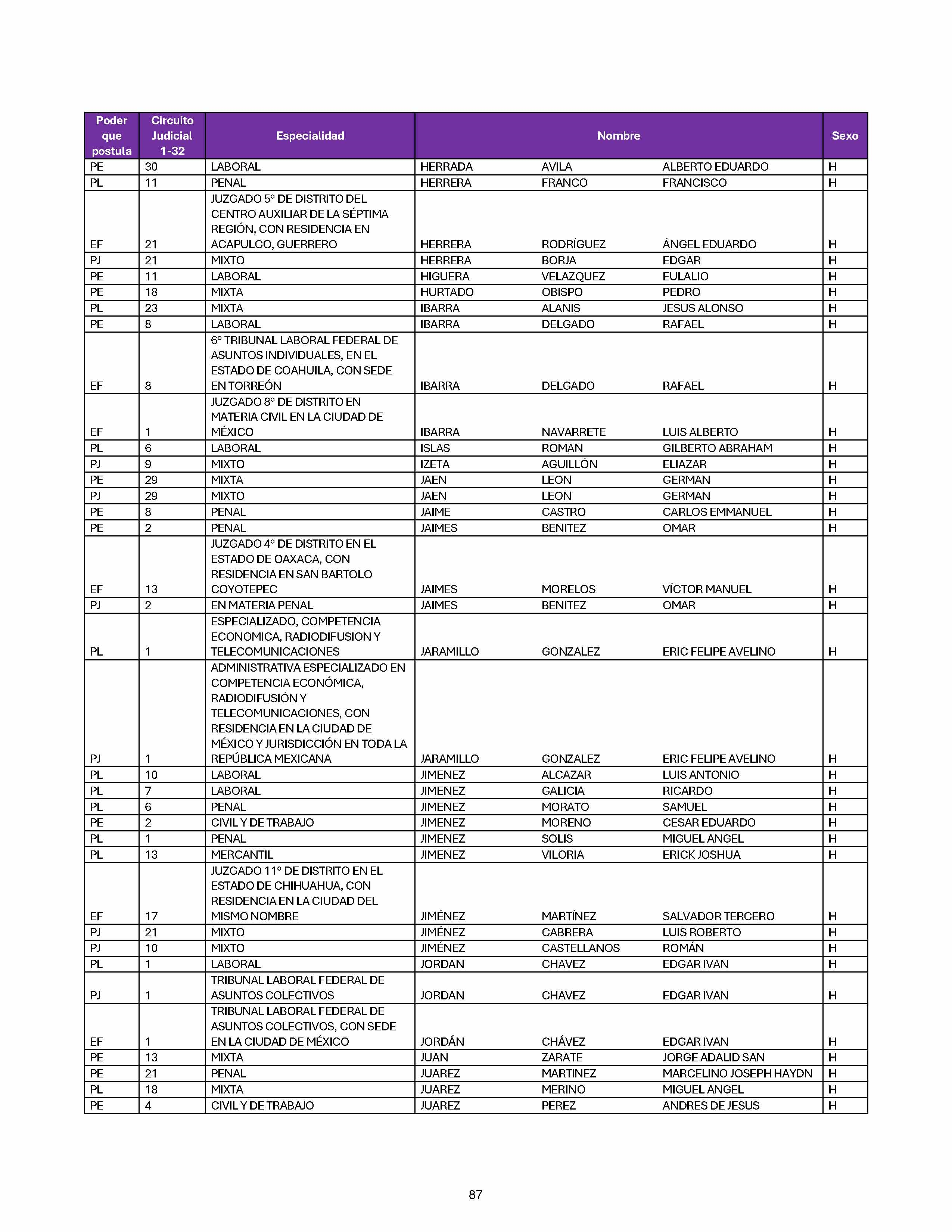 XVIII. Insaculación de la Mesa Directiva del Senado de la República. El 2 de febrero de 2025 se publicó en el DOF la lista que contiene la relación de los nombres que resultaron insaculados por la Mesa Directiva del Senado, ajustada al número de postulaciones para cada cargo, atendiendo a su especialidad por materia y observando la paridad de género, así como los nombres de las personas de aquellos cargos en los que no existió el número de aspirantes necesarios para las ternas o duplas correspondientes y que no se sometieron al procedimiento de insaculación pública, para determinar las candidaturas del Poder Judicial de la Federación en relación con el PEEPJF 2024-2025.