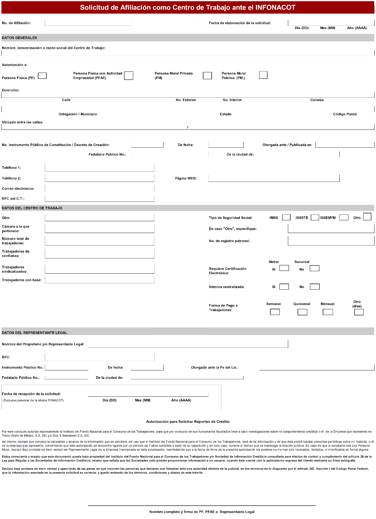 | 1 | S/H | Afiliación de Centros de Trabajo al INFONACOT | I. Se fusionan las modalidades: 1. Sector Privado 2. Sector Público II. Se elimina como requisito y se establece como condicional: 1. E-firma del Propietario o Representante Legal, así como del Centro de Trabajo, únicamente cuando el trámite se realice por medios electrónicos. | I. Formato de solicitud. II. Constancia de Situación Fiscal. III. Identificación oficial vigente de la persona facultada para suscribir el Convenio. En caso de personas físicas y/o morales que cuenten con un representante legal, instrumento público. En caso de un Centro de Trabajo perteneciente al sector público, deberá presentar instrumento público y/o nombramiento de la persona facultada. IV. Acta constitutiva. Únicamente para personas morales. |