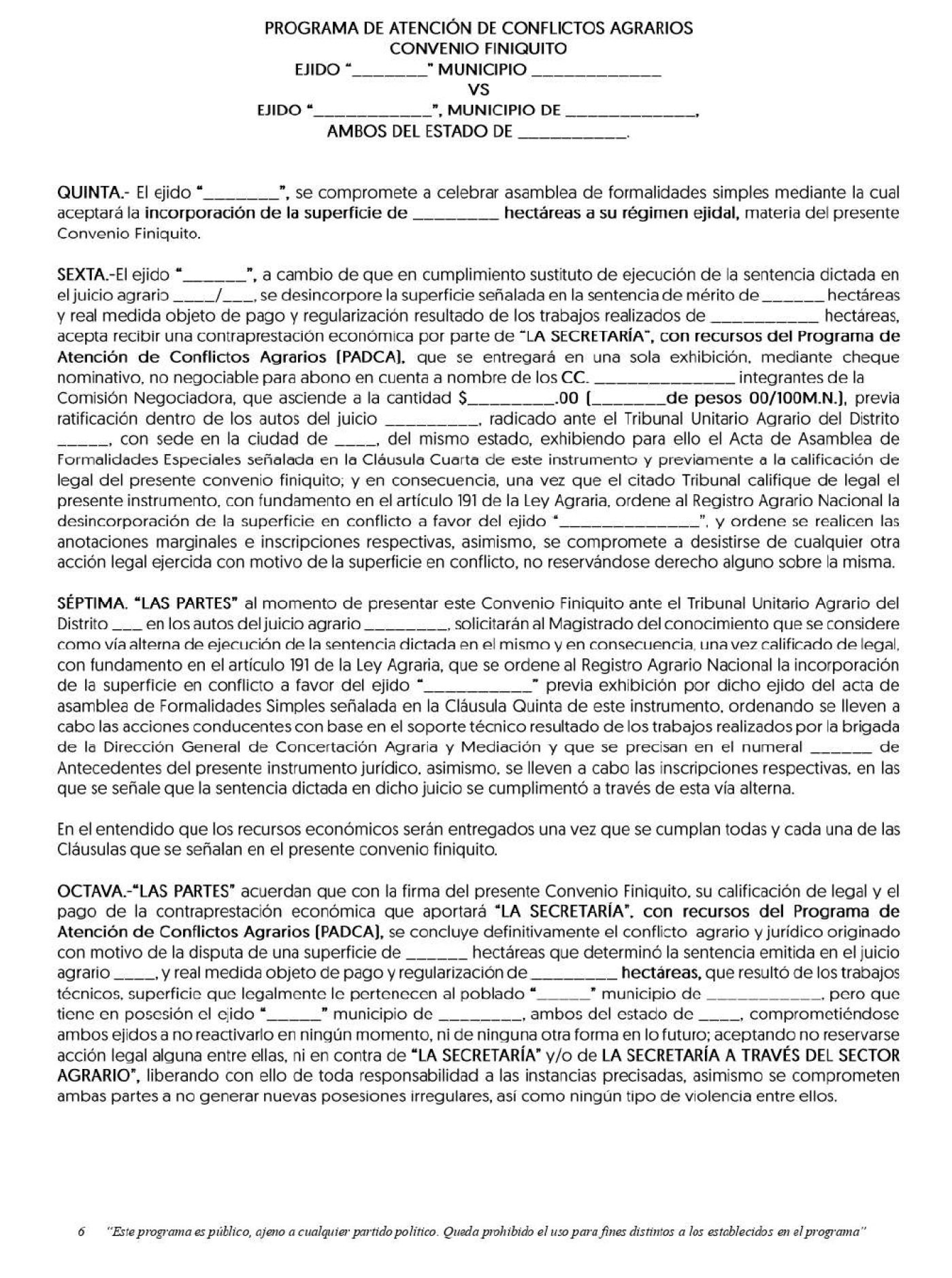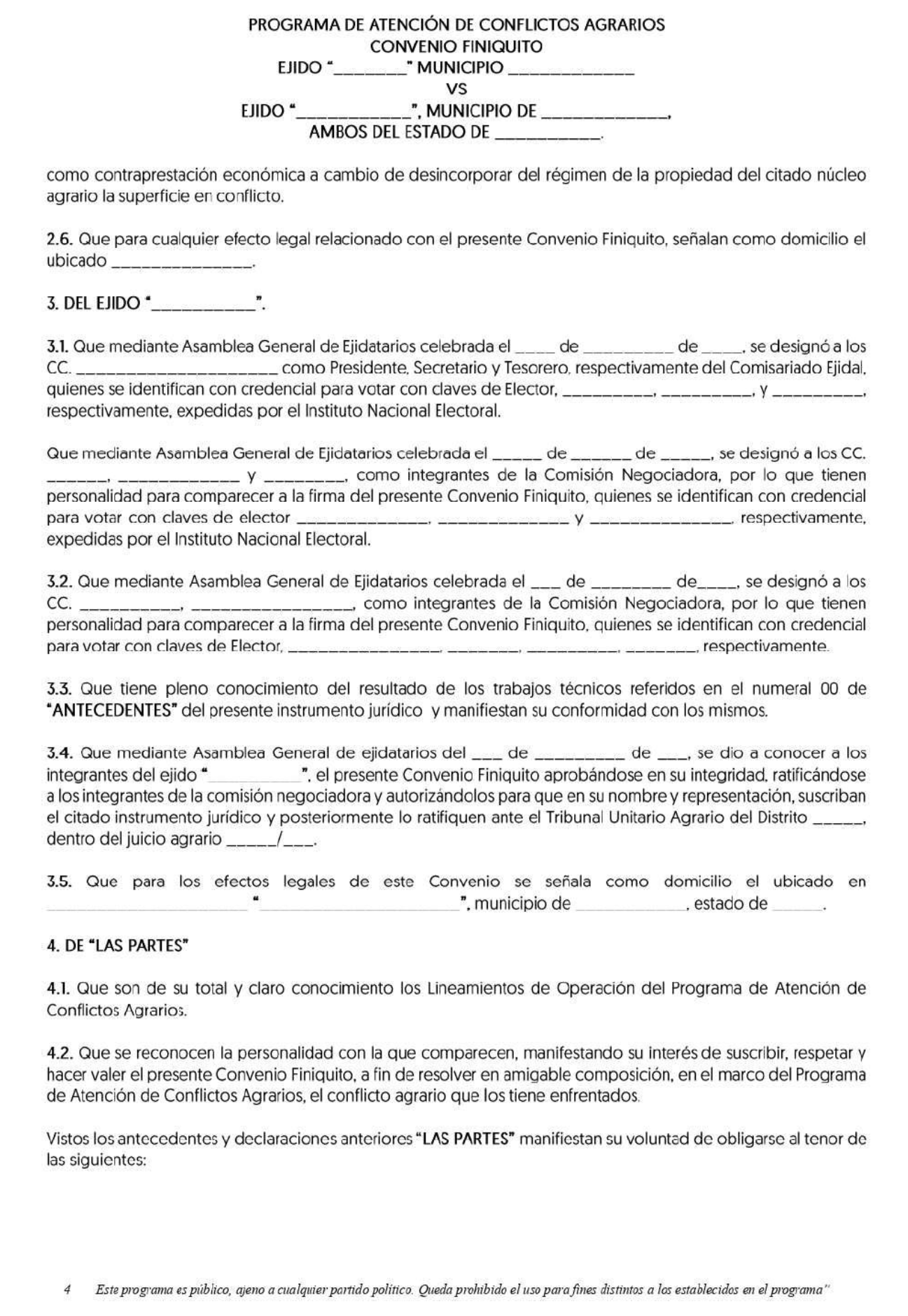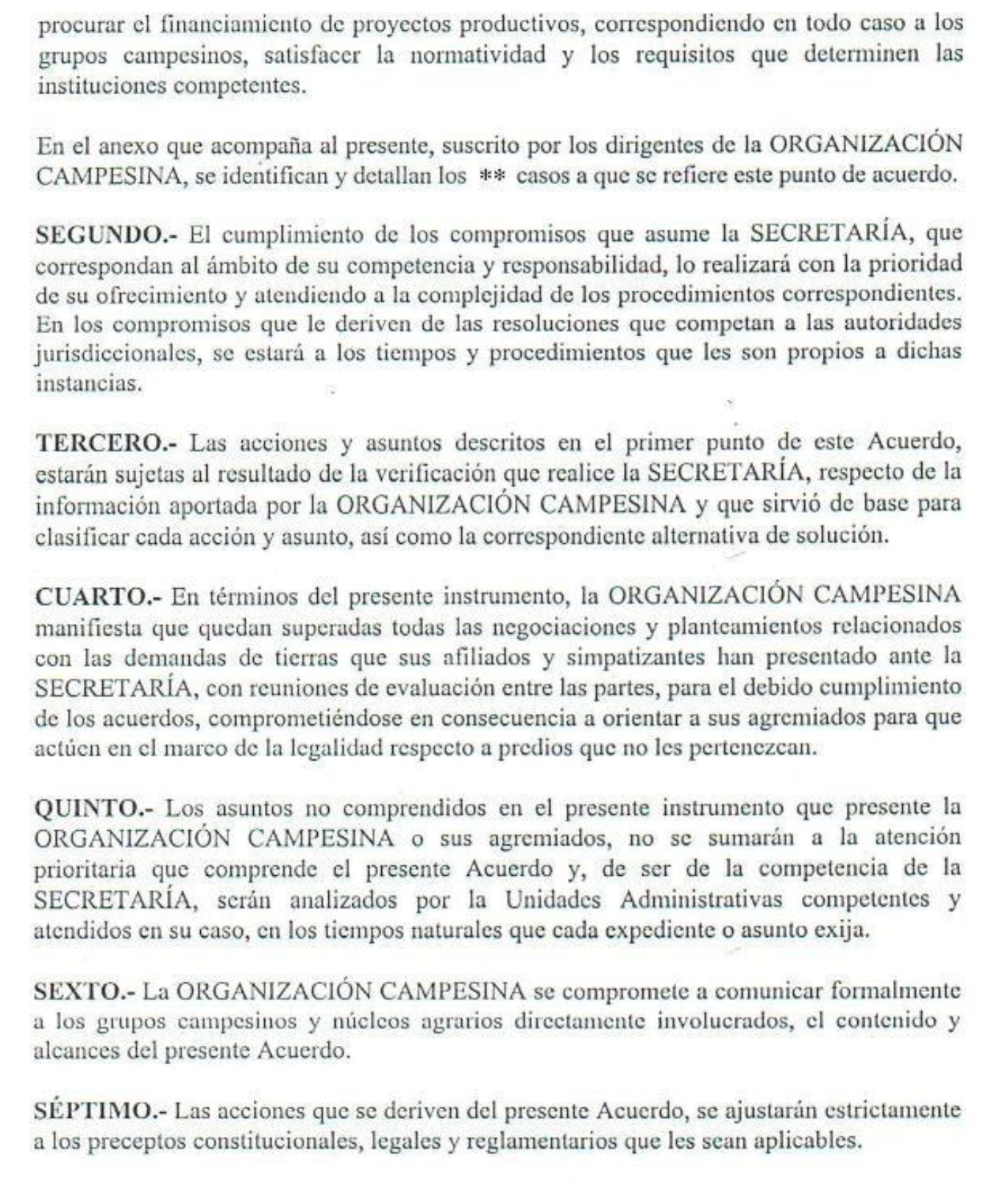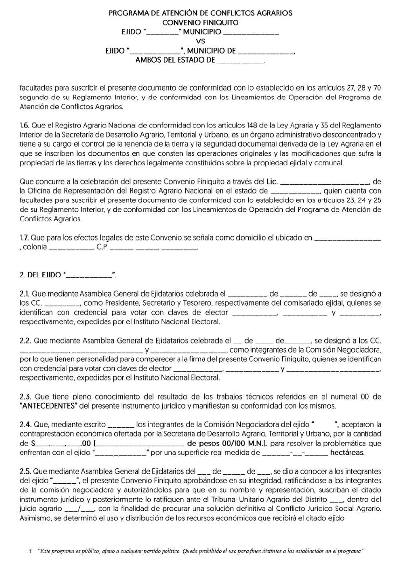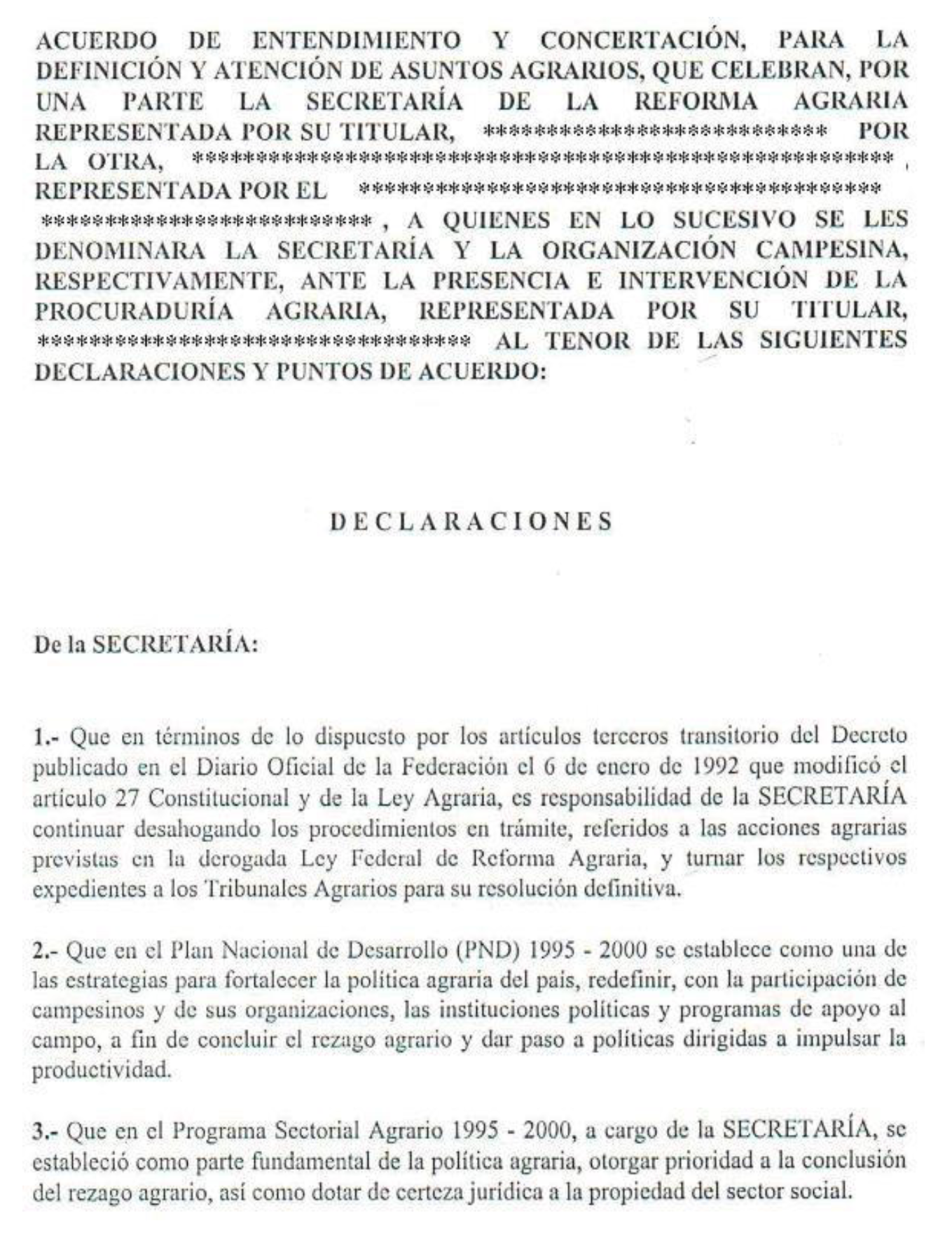 Que posterior a la reforma de 1992 al artículo 27 de la Constitución Política de los Estados Unidos Mexicanos (CPEUM), en la que se declaró la conclusión del reparto agrario, el Gobierno Federal revisó la problemática del campo mexicano, pues si bien las acciones de reparto habían concluido, los problemas por la propiedad y/o posesión de la tierra aún persistían. La atención a esos conflictos surgió con la suscripción, por la entonces Secretaría de la Reforma Agraria (SRA), entre los años de 1996 y 1998, de diversos Acuerdos Agrarios (Anexo 1. Formato de Acuerdo Agrario). En 2002, la SRA analizó la conflictividad agraria en el territorio nacional y conformó la Agenda Agraria Nacional, identificando la existencia de conflictos en donde se involucraban tierras de propiedad social. En 2003, el Ejecutivo Federal y los representantes de diversas organizaciones de productores y campesinos, suscribieron el Acuerdo Nacional para el Campo (Anexo 2. Formato de Acuerdo Nacional para el Campo) publicado en el Diario Oficial de la Federación (DOF) el 28 de abril del mismo año, en el que se precisó que se atenderían prioritariamente los conflictos agrarios derivados de la problemática de la tenencia de la tierra, privilegiando la vía de la conciliación en las disputas de naturaleza jurídica, administrativa y social (Auditoría Superior de la Federación, "Informe del Resultado de la Fiscalización Superior de la Cuenta Pública 2014");