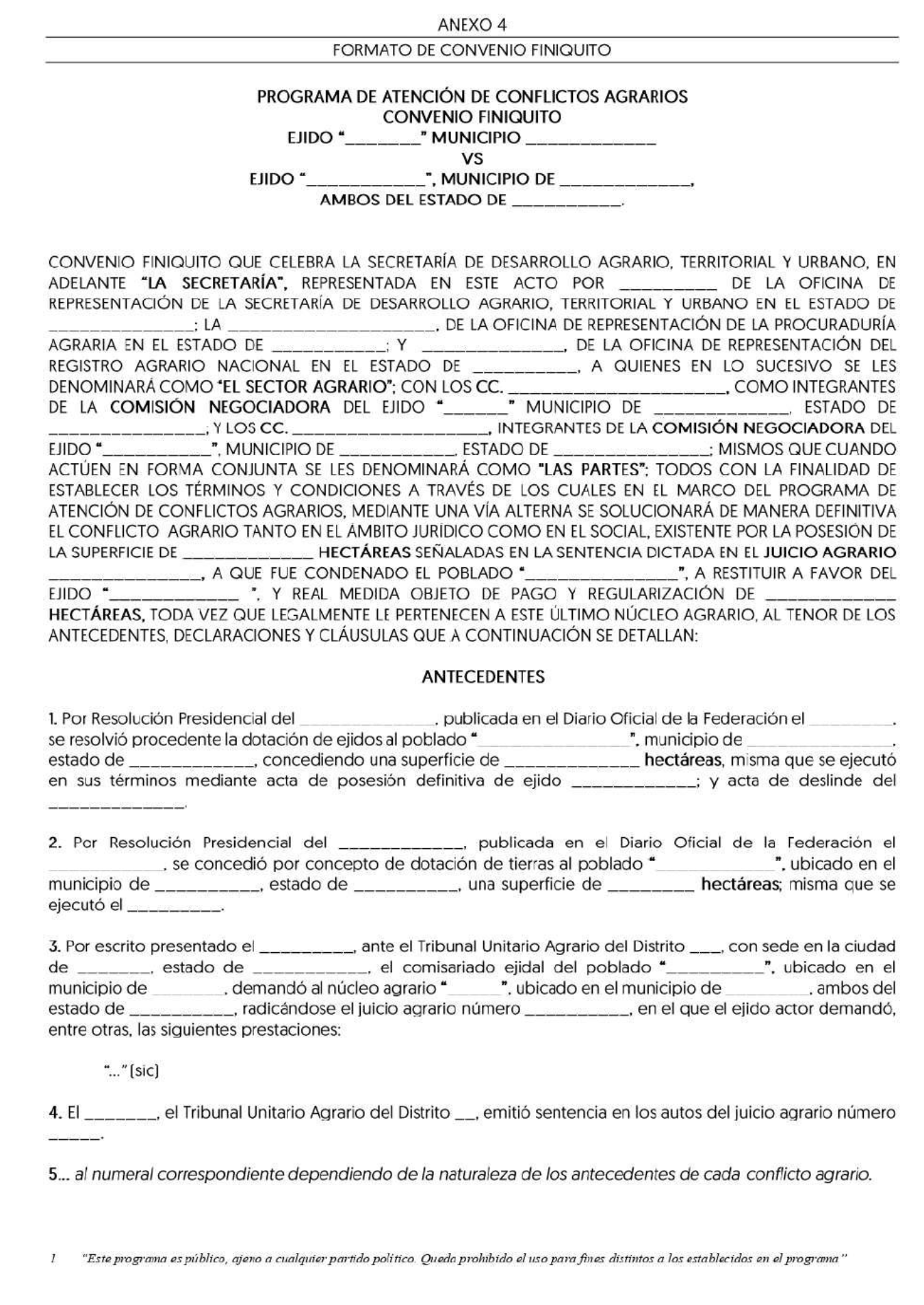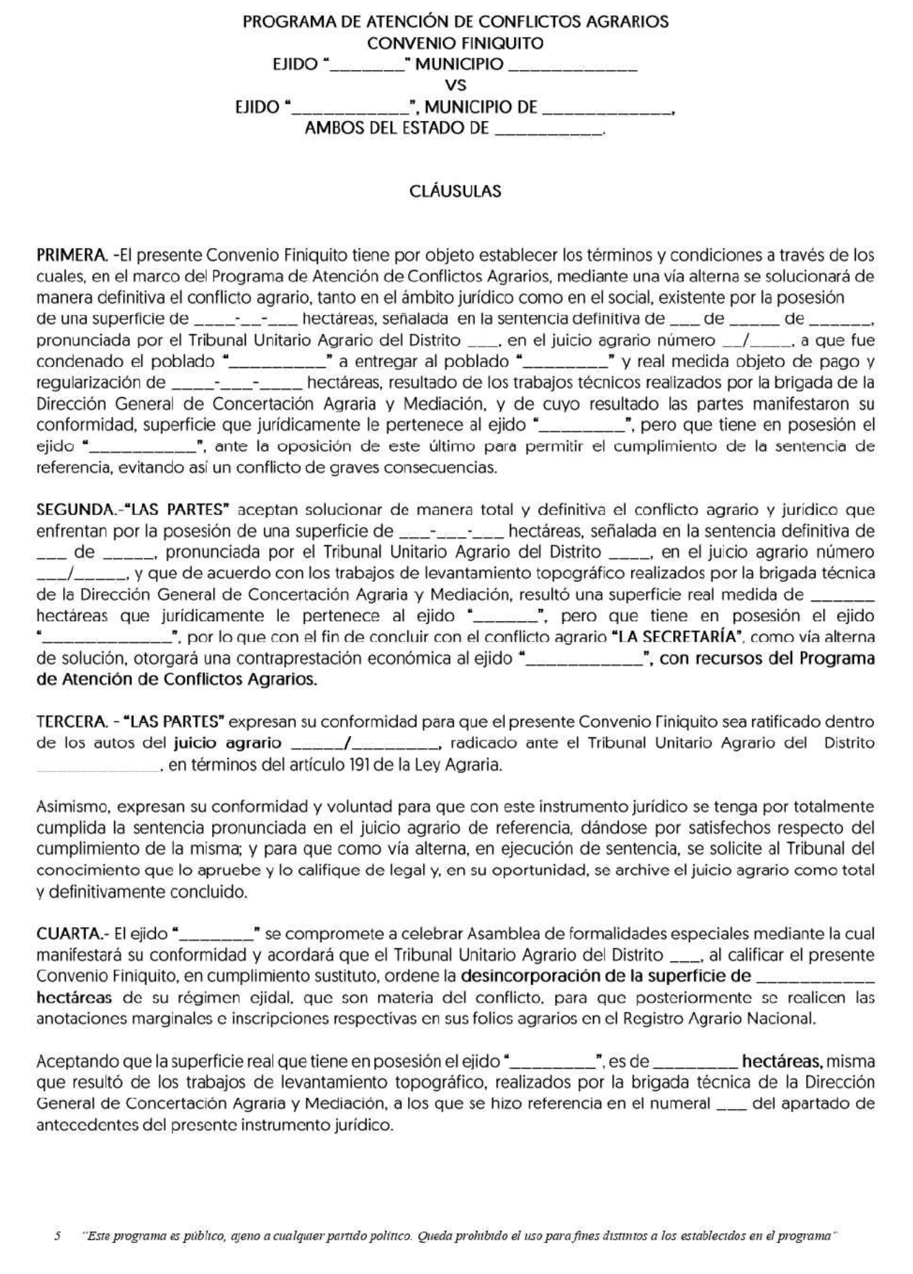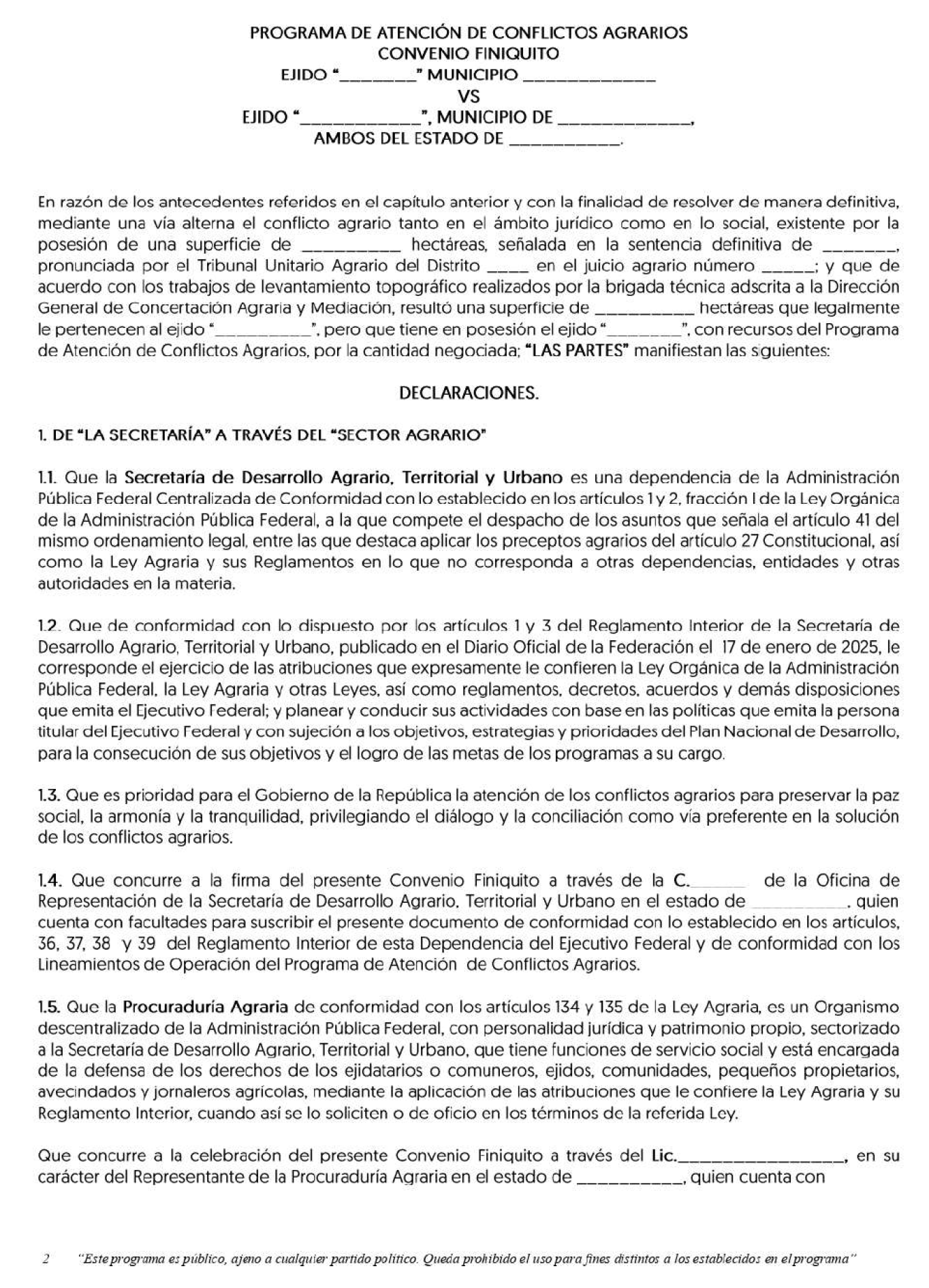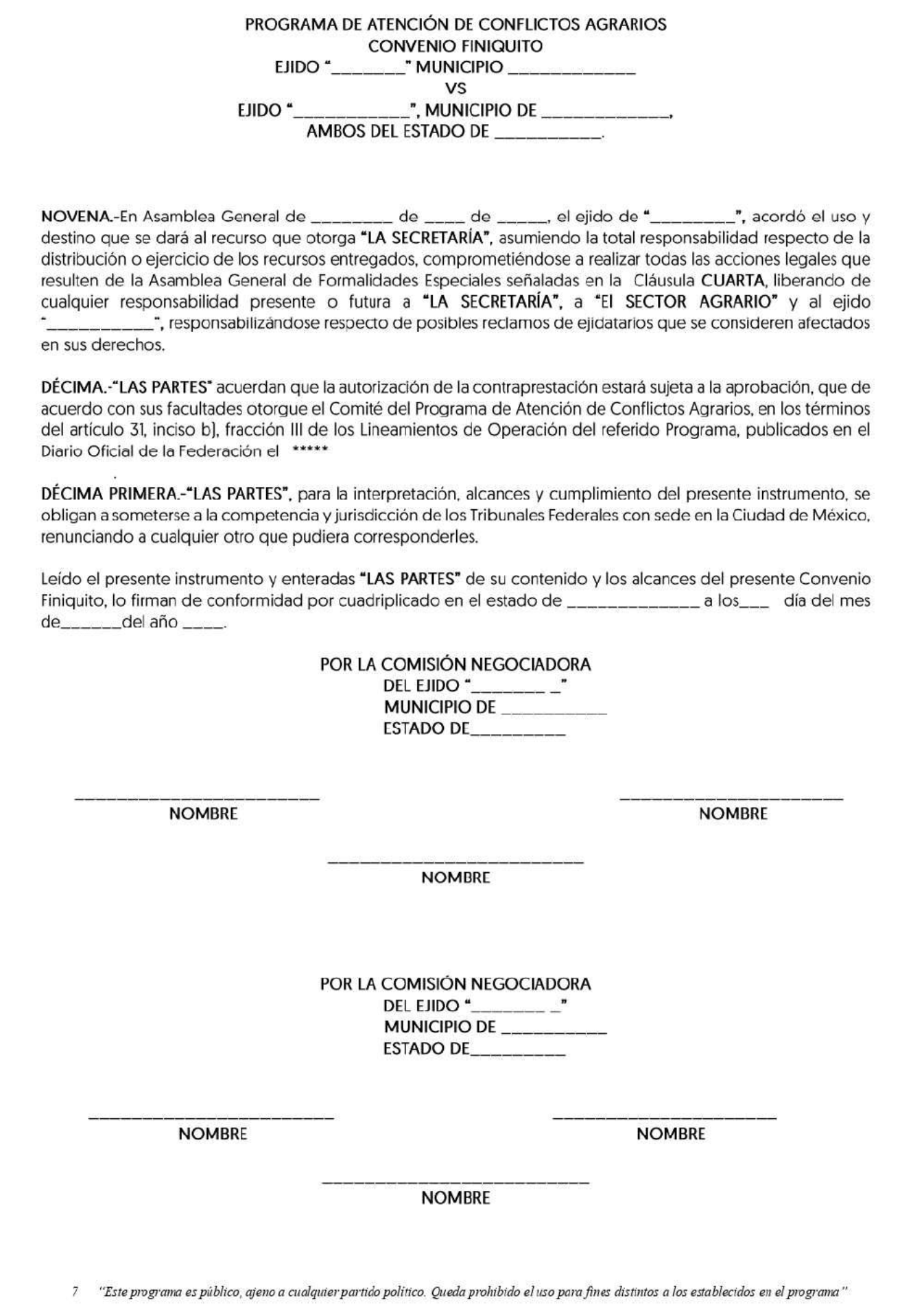 Que posterior a la reforma de 1992 al artículo 27 de la Constitución Política de los Estados Unidos Mexicanos (CPEUM), en la que se declaró la conclusión del reparto agrario, el Gobierno Federal revisó la problemática del campo mexicano, pues si bien las acciones de reparto habían concluido, los problemas por la propiedad y/o posesión de la tierra aún persistían. La atención a esos conflictos surgió con la suscripción, por la entonces Secretaría de la Reforma Agraria (SRA), entre los años de 1996 y 1998, de diversos Acuerdos Agrarios (Anexo 1. Formato de Acuerdo Agrario). En 2002, la SRA analizó la conflictividad agraria en el territorio nacional y conformó la Agenda Agraria Nacional, identificando la existencia de conflictos en donde se involucraban tierras de propiedad social. En 2003, el Ejecutivo Federal y los representantes de diversas organizaciones de productores y campesinos, suscribieron el Acuerdo Nacional para el Campo (Anexo 2. Formato de Acuerdo Nacional para el Campo) publicado en el Diario Oficial de la Federación (DOF) el 28 de abril del mismo año, en el que se precisó que se atenderían prioritariamente los conflictos agrarios derivados de la problemática de la tenencia de la tierra, privilegiando la vía de la conciliación en las disputas de naturaleza jurídica, administrativa y social (Auditoría Superior de la Federación, "Informe del Resultado de la Fiscalización Superior de la Cuenta Pública 2014");