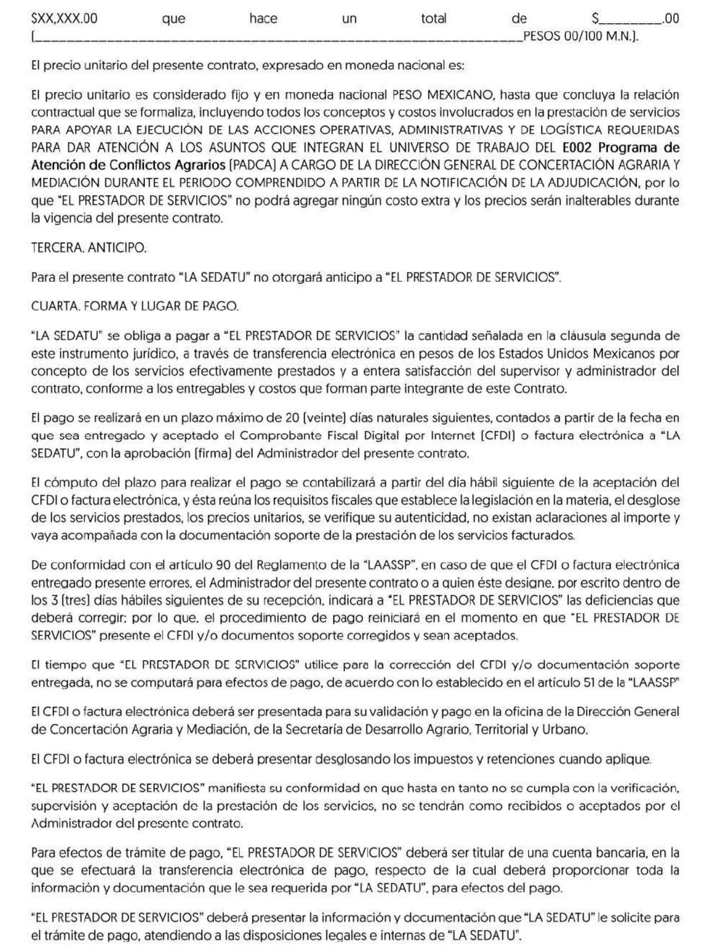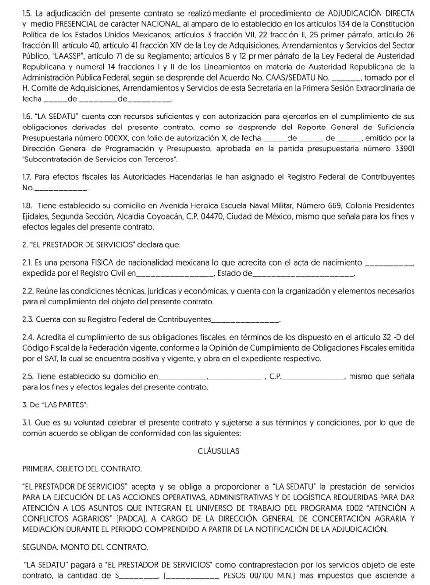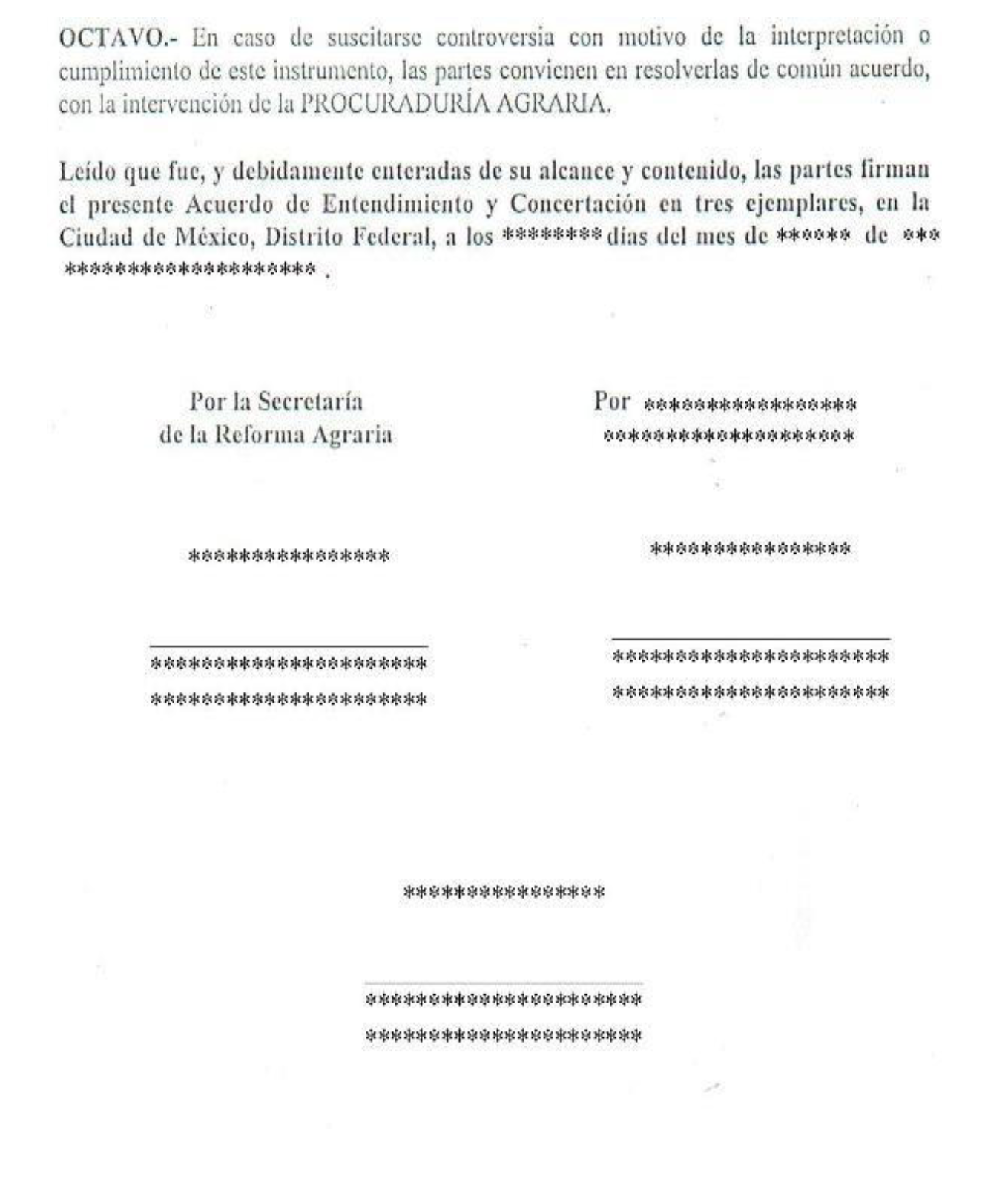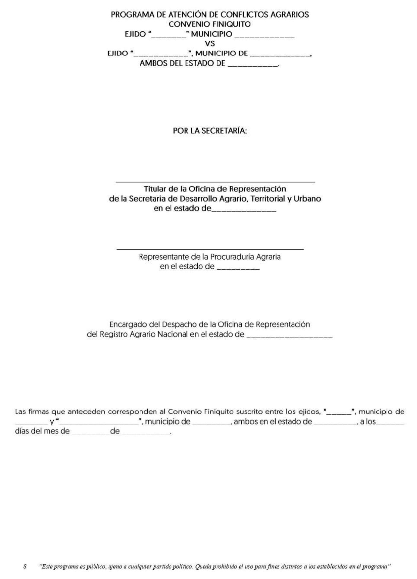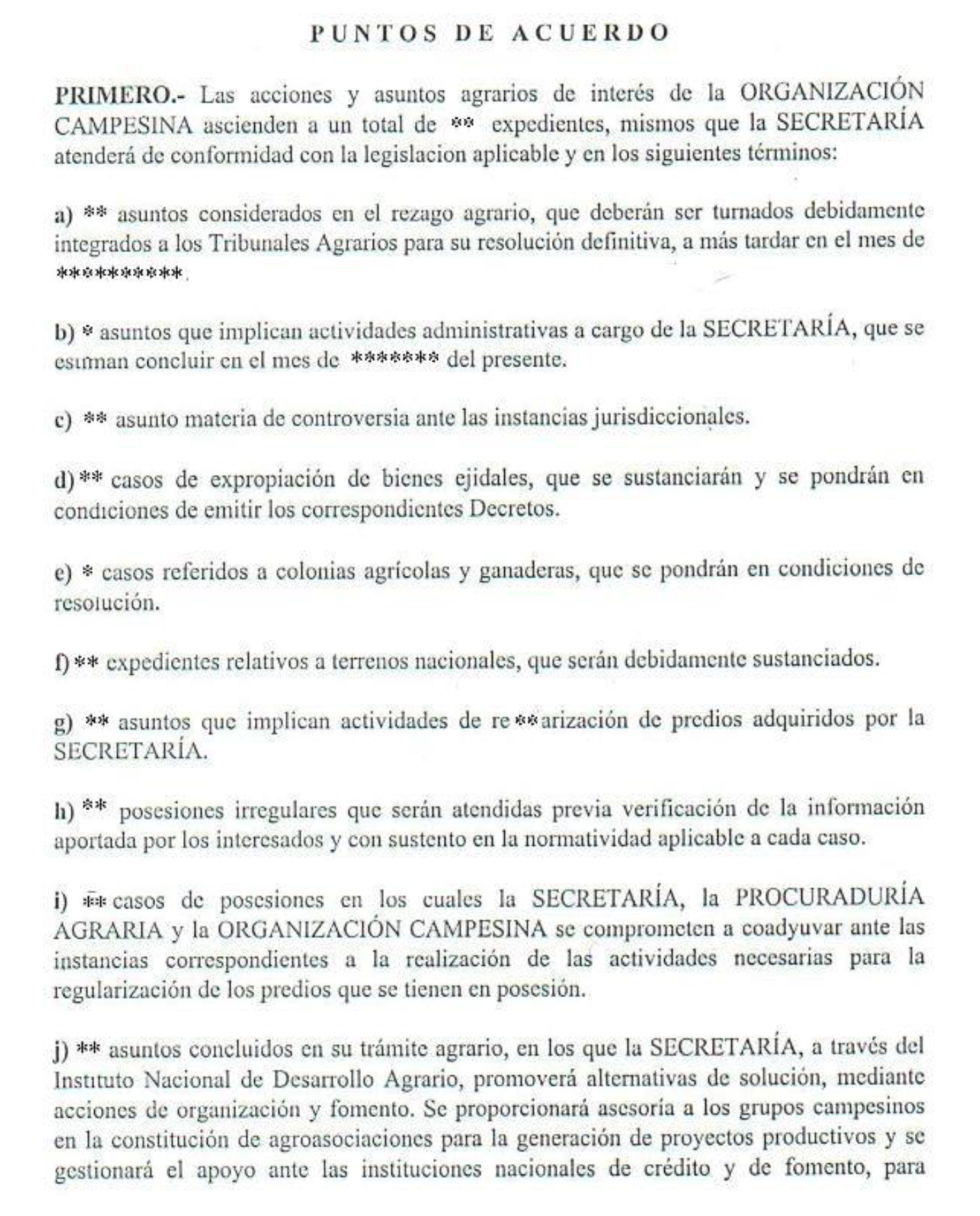 Que posterior a la reforma de 1992 al artículo 27 de la Constitución Política de los Estados Unidos Mexicanos (CPEUM), en la que se declaró la conclusión del reparto agrario, el Gobierno Federal revisó la problemática del campo mexicano, pues si bien las acciones de reparto habían concluido, los problemas por la propiedad y/o posesión de la tierra aún persistían. La atención a esos conflictos surgió con la suscripción, por la entonces Secretaría de la Reforma Agraria (SRA), entre los años de 1996 y 1998, de diversos Acuerdos Agrarios (Anexo 1. Formato de Acuerdo Agrario). En 2002, la SRA analizó la conflictividad agraria en el territorio nacional y conformó la Agenda Agraria Nacional, identificando la existencia de conflictos en donde se involucraban tierras de propiedad social. En 2003, el Ejecutivo Federal y los representantes de diversas organizaciones de productores y campesinos, suscribieron el Acuerdo Nacional para el Campo (Anexo 2. Formato de Acuerdo Nacional para el Campo) publicado en el Diario Oficial de la Federación (DOF) el 28 de abril del mismo año, en el que se precisó que se atenderían prioritariamente los conflictos agrarios derivados de la problemática de la tenencia de la tierra, privilegiando la vía de la conciliación en las disputas de naturaleza jurídica, administrativa y social (Auditoría Superior de la Federación, "Informe del Resultado de la Fiscalización Superior de la Cuenta Pública 2014");