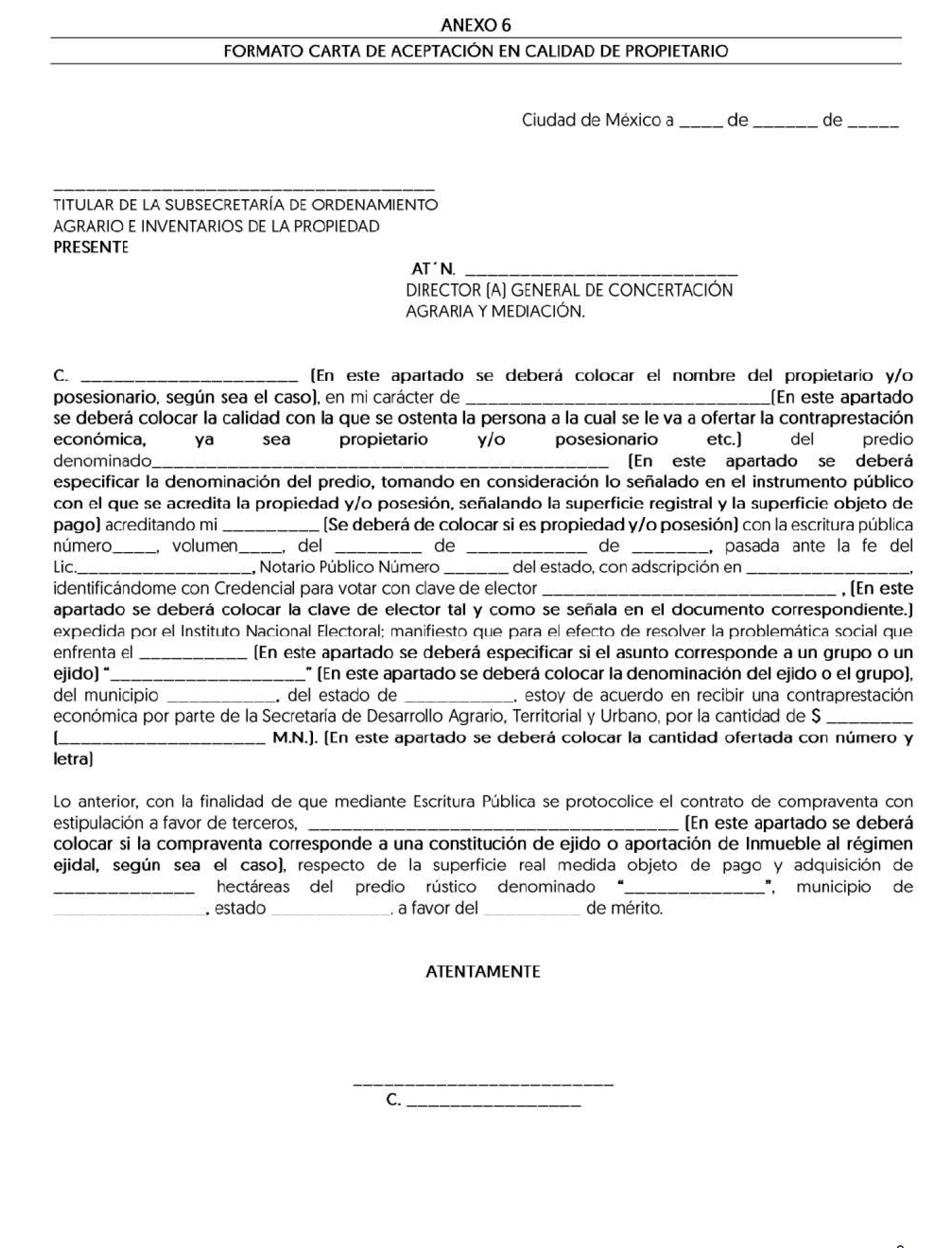 En los casos de los AA y aquellos determinados como viables por la Comisión de Elegibilidad del ANC se requerirá una carta de aceptación (Anexo 6. Formato Carta de Aceptación) de la oferta institucional hecha por la SEDATU, suscrita por la persona propietaria del predio o su apoderado legal; así como, copia de la minuta del acta de aprobación de la citada Comisión, independientemente de que el asunto haya sido autorizado por el COMAC como parte del universo de trabajo.