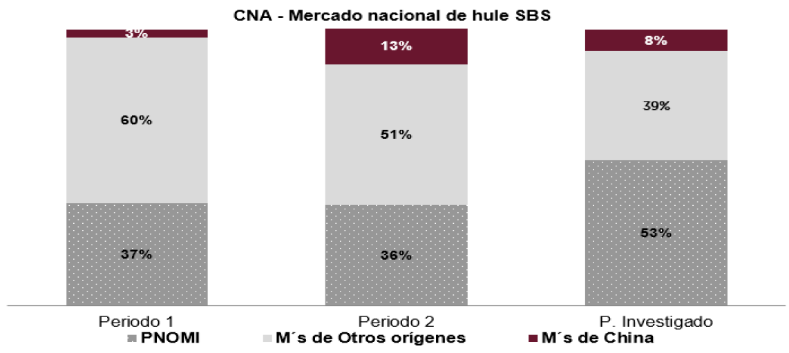 205. Al respecto, la Secretaría observó que la demanda de hule SBS nacional, en términos del CNA, registró un incremento de 7.1% en el periodo analizado y una contracción de 3.2% en el periodo investigado. En este contexto de mercado, tanto la rama de producción nacional como las importaciones originarias de China ganaron participación de mercado en detrimento de las importaciones de otros orígenes. En efecto, durante el periodo analizado, las importaciones de otros orígenes disminuyeron 30%, mientras que las originarias de China se incrementaron 192% y la PNOMI aumentó 53%, por lo que el comportamiento del mercado no podría considerarse como una causa de amenaza de daño a la rama de producción nacional. Destaca que, aunque el mercado se contrajo en el periodo investigado, la producción orientada al mercado interno logró mantener un crecimiento de 41% gracias a la reducción de 24% en los precios de venta al mercado interno, para competir con las importaciones investigadas cuyos precios se redujeron 39% en dicho periodo y alcanzaron una subvaloración de 51%.