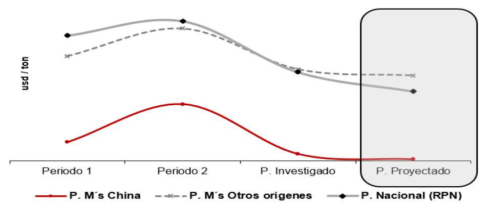 206. Si bien el precio de las importaciones de otros orígenes se ubicó por debajo del precio de venta al mercado interno de la rama de producción nacional en los dos primeros periodos del analizado, no existe una relación económica que indique que dichas importaciones fueran causa de la amenaza de daño a la producción nacional, pues mostraron un comportamiento decreciente. En efecto, su volumen se redujo 30% en el periodo analizado (disminuyeron 7% en el periodo 2 y 24% en el periodo investigado), de modo que perdieron 21 puntos porcentuales de participación de mercado en dicho periodo. En relación con las importaciones totales, pasaron de una participación de 95.5% en el periodo 1 a 83.5% en el periodo investigado, lo que significó una pérdida acumulada de 12 puntos porcentuales de participación en el periodo analizado. De tal manera, aun cuando las importaciones de otros orígenes mostraron precios bajos, estos no fueron un factor que contribuyera al desplazamiento de la producción nacional.