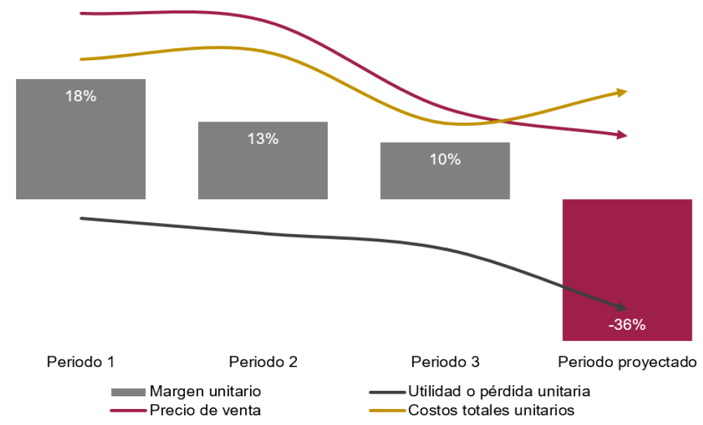 i. Los resultados de las proyecciones de los indicadores económicos y financieros de la rama de producción nacional para el periodo posterior al investigado reflejaron una afectación al mantenerse la presencia de las importaciones investigadas en condiciones de discriminación de precios en el mercado nacional. En particular, se observaría un comportamiento negativo en los precios de venta al mercado interno (-12%), el volumen de producción total (-5%), la participación de mercado (-1.4 puntos porcentuales), la productividad (-2%), el empleo (-3%), la utilización de la capacidad instalada (-3.7 puntos porcentuales), los ingresos por ventas al mercado interno (-8%), la utilidad operativa (-63%) y el margen operativo (-8.6 puntos porcentuales), al pasar de 14.5% en el periodo investigado a 5.9% en el periodo proyectado.