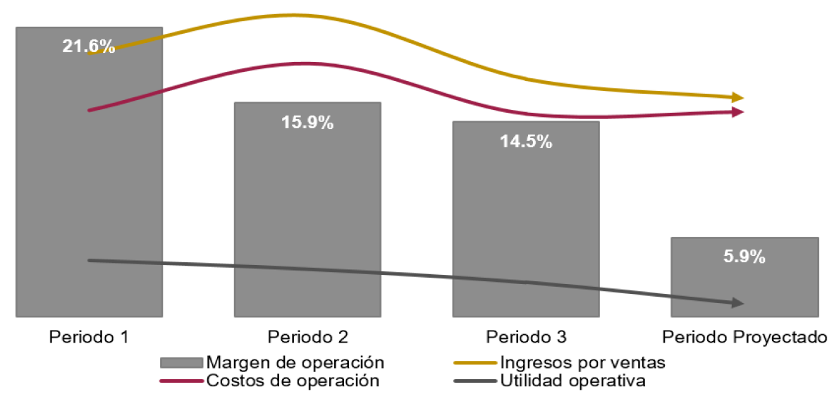 180. Adicionalmente, los resultados operativos proyectados reflejarían una disminución de los ingresos por ventas en el mercado interno de 8%, mientras que los costos de operación incrementarían 1%, dando como resultado una baja de 63% en la utilidad operativa. Ello daría lugar a una disminución del margen de operación de 8.6 puntos porcentuales al pasar de 14.5% en el periodo investigado a 5.9% en el periodo proyectado, tal como se observa en la siguiente gráfica.