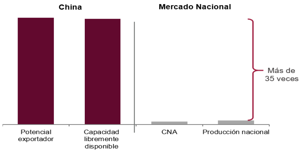 b. El potencial exportador de China (capacidad instalada menos consumo) creció 11% en el periodo investigado y 25% en el periodo analizado. El volumen que registró en el periodo investigado fue equivalente a más de 35 veces el tamaño del CNA y a más de 26 veces el tamaño de la producción de dicho periodo.