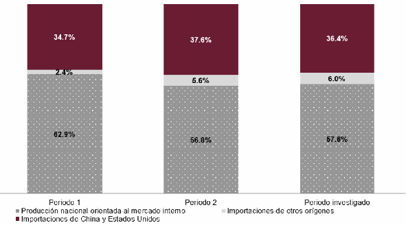182. La Secretaría advirtió que -dado el crecimiento del mercado en el periodo analizado- las importaciones de perfiles huecos de aluminio originarias de China y los Estados Unidos, así como las de otros orígenes ganaron participación de mercado en detrimento de la producción orientada al mercado interno de la rama de producción nacional. Destaca que las importaciones investigadas abastecieron 36.3% del mercado nacional durante el periodo analizado, mientras que las importaciones de otros orígenes cubrieron solo 4.8% de la demanda de perfiles huecos de aluminio. En este contexto de un mercado nacional creciente, la producción orientada al mercado interno de la rama de producción nacional perdió 2.5 puntos porcentuales de participación en el CNA en el periodo analizado, al pasar de una participación de 43.7% en el periodo 1 a 41.2% en el periodo investigado. Por su parte, las importaciones investigadas ganaron 1.7 puntos de participación en el periodo analizado, al pasar de 34.7% en el periodo 1 a 36.4% en el periodo investigado, mientras que las importaciones de otros orígenes ganaron 3.6 puntos de participación en el periodo analizado al pasar de 2.4% en el periodo 1 a 6.0% en el periodo investigado.