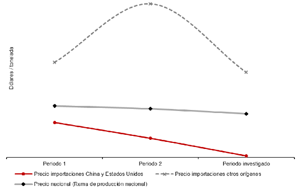 c. En el periodo analizado el precio promedio de las importaciones investigadas mostró una caída de 22% y registró niveles crecientes de subvaloración con respecto al precio de venta al mercado interno de la rama de producción nacional, a pesar de la depresión de precios que sufrió la rama de producción nacional. En efecto, el porcentaje de subvaloración fue 10% en el periodo 1, 18% en el periodo 2 y 27% en el periodo investigado. Asimismo, se ubicó por debajo del precio promedio de las importaciones de otros orígenes en porcentajes de 29%, 50% y 42%, respectivamente, en los mismos periodos.