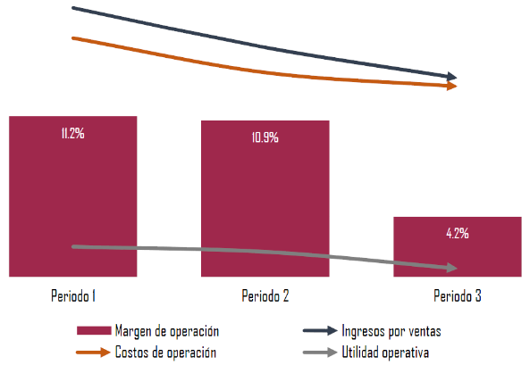 a. Los ingresos por ventas disminuyeron 15% en el periodo 2 y 13% en el periodo investigado, lo que reflejó una reducción de 26% en el periodo analizado. De igual manera, los costos de operación u operativos -entendiendo estos como la suma de los costos de venta más los gastos de operación- disminuyeron 14% en el periodo 2 y 7% en el periodo investigado, dando como resultado una disminución de 20% en el periodo analizado.