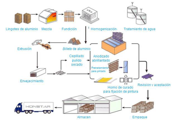 14. Después de salir de la matriz, la extrusión de billets o palanquillas se enfría y puede ser estirada, cortada, o endurecida por envejecimiento, ya sea natural o artificialmente a través de hornos. Asimismo, pueden someterse a un acabado o procesamiento adicional, como revestimiento o tratamientos de superficie, por ejemplo, pintura, anodizado, lijado, grabado ácido o acabado con níquel, entre otros.