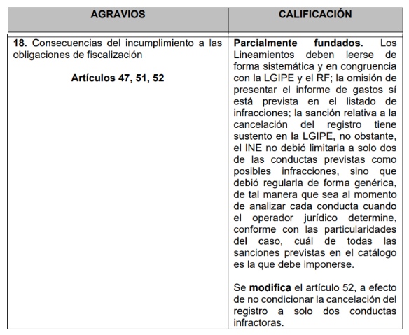 En consecuencia, es incorrecto que desde los Lineamientos el INE determinara que las restantes conductas previstas en el artículo 51 no son de la naturaleza suficiente para que sean sancionadas con la cancelación del registro, cuando esa determinación deberá tomarse una vez que analice cada caso.