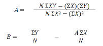La pendiente de la recta (A) y la intersección con el eje de las ordenadas se calculan usando las siguientes dos ecuaciones de regresión lineal: