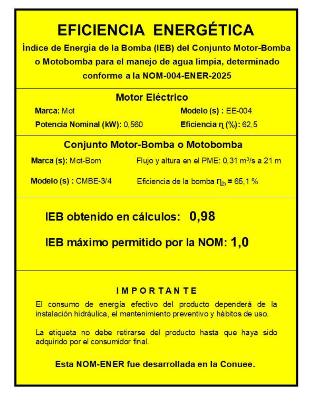 NORMA OFICIAL MEXICANA NOM-004-ENER-2025, EFICIENCIA ENERGÉTICA PARA EL CONJUNTO MOTORBOMBA Y MOTOBOMBAS, PARA BOMBEO DE AGUA LIMPIA, EN POTENCIAS DE 0,149 kW (1/5 HP) HASTA 1,492 kW (2 HP). LÍMITES, MÉTODOS DE PRUEBA Y ETIQUETADO.