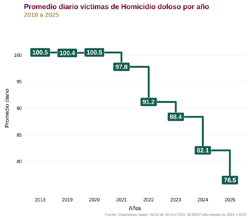 El promedio diario de víctimas de homicidio doloso tuvo una reducción de 23.8% entre 2018 y enero de 2025, pasando de un promedio de 100.5 a 76.5 víctimas diarias, de acuerdo con datos del INEGI(5) para el periodo 2018-2023, complementados con información del Secretariado Ejecutivo del Sistema Nacional de Seguridad Pública (SESNSP) para 2024 y enero de 2025.