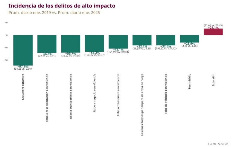 De los delitos de alto impacto, el único que ha presentado un incremento del 21.1% es el delito de extorsión, toda vez que en 2019 se presentaba un promedio diario de 22.68, mientras que en 2025 es de 27.45.