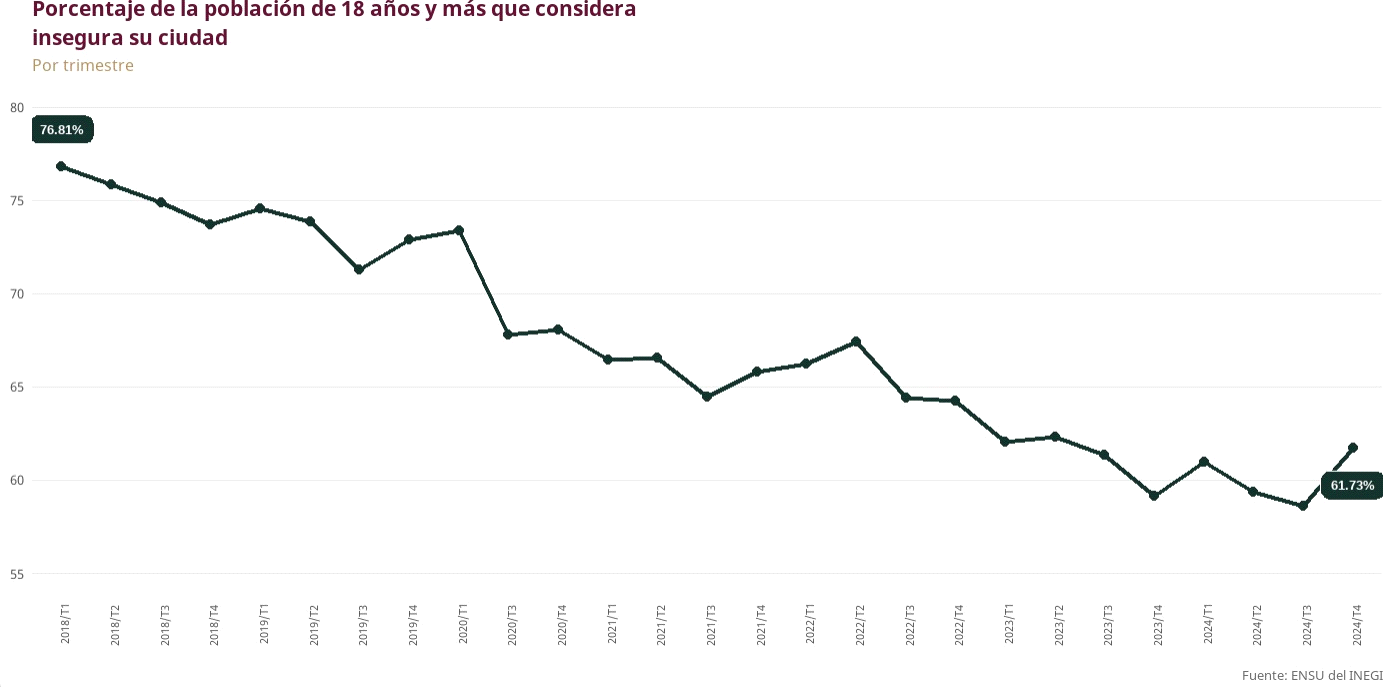 De acuerdo con la Encuesta Nacional de Seguridad Pública Urbana (ENSU) del INEGI(6), desde 2018 la percepción de inseguridad en la población de 18 años y más ha mostrado una tendencia a la baja. Mientras que en el primer trimestre de 2018, el 76.8% de la población manifestó sentirse insegura en su ciudad, en el último trimestre de 2024, esta cifra fue de 61.7%, lo que representa una reducción en el indicador de percepción de inseguridad del 15%. A pesar de esta disminución, más de la mitad de la población que habita en zonas urbanas sigue percibiendo inseguridad, lo que continúa siendo un reto importante en materia de seguridad pública.