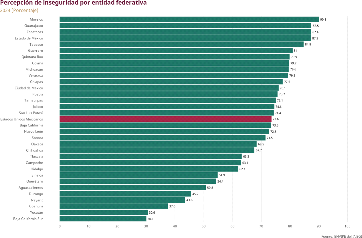 Las entidades federativas con mayor porcentaje de personas de 18 años y más, que consideraron que vivir en su ciudad era inseguro fueron: Morelos con 90.1%; Guanajuato con el 87.5%; Zacatecas con el 87.4%; Estado de México con el 87.3%, y Tabasco con el 84.8%. En contraste, las entidades con menores porcentajes de percepción de inseguridad fueron: Coahuila de Zaragoza (37.6%); Yucatán (30.6%), y Baja California Sur (30.1%).