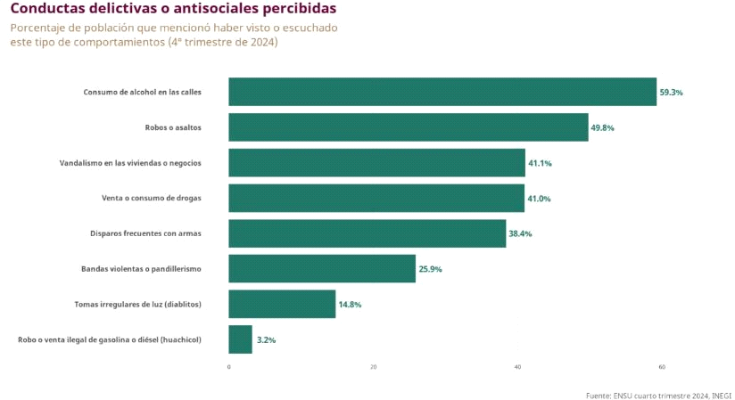 Referente a la atestiguación de conductas delictivas o antisociales, de la población que mencionó haber visto o escuchado este tipo de comportamientos en los alrededores de su vivienda, durante el cuarto trimestre de 2024, un 59.3% se relacionó con consumo de alcohol en las calles; 49.8%, con robos o asaltos; 41.1%, con vandalismo en las viviendas o negocios; 41%, con venta o consumo de drogas; 38.4%, con disparos frecuentes con armas; 25.9%, con bandas violentas o pandillerismo; 14.8%, con tomas irregulares de luz (diablitos), y 3.2%, con robo o venta ilegal de gasolina o diésel (huachicol).