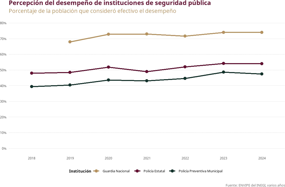 En diciembre de 2024, los porcentajes de la población de 18 años y más, que identificó a las diversas autoridades de seguridad pública y que percibió su desempeño como muy o algo efectivo en sus labores para prevenir y combatir la delincuencia fueron: GN, con 74%; policía estatal, con 53.9%, y policía preventiva municipal, con 47.5%.