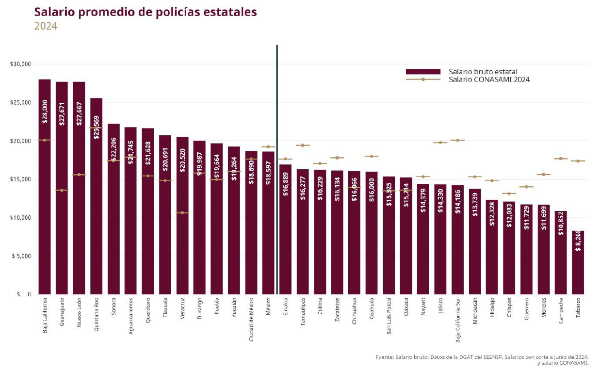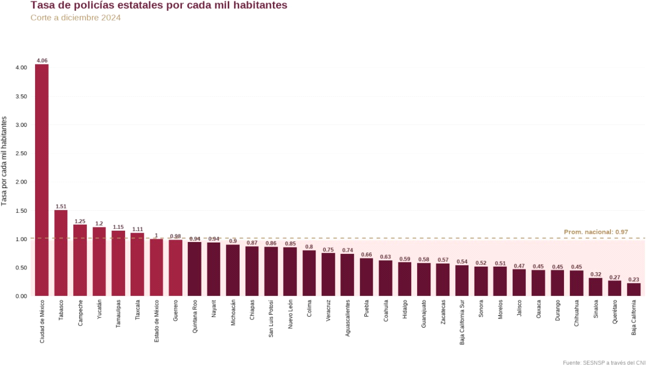 El promedio de la tasa nacional de policías estatales es de 0.97 por cada mil habitantes. No obstante, únicamente ocho entidades están por encima de la media nacional. Aunado a esto, la variación entre los extremos es amplia, pues Ciudad de México cuenta con una tasa de 4.06, mientras que Baja California tiene una tasa de 0.23.