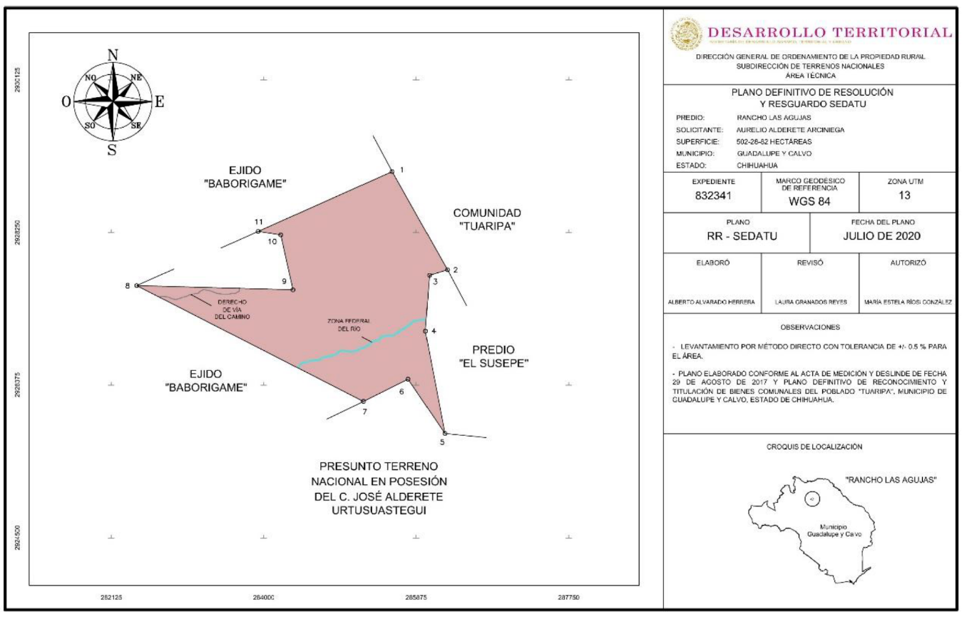 Que, como acto de resarcimiento para hacer justicia y atender parcialmente los reclamos territoriales de la Comunidad Mesa Colorada, perteneciente al Pueblo Ódami (Tepehuano del Norte), del estado de Chihuahua, se ha estimado procedente restituir sus tierras mediante el reconocimiento de la propiedad y posesión tradicional que dicha Comunidad ha detentado respecto de una superficie de 502-28-82 hectáreas (quinientas dos hectáreas, veintiocho áreas y ochenta y dos centiáreas), ubicadas en el predio denominado "Rancho las Agujas", municipio de Guadalupe y Calvo, estado de Chihuahua, del cual se tiene constancia que carece de título de propiedad privada o social y que se encuentran bajo dominio de la Nación; en consecuencia, es procedente expedir el presente decreto como título de propiedad comunal tradicional a favor de la Comunidad Mesa Colorada. Dicha superficie se puede identificar con los siguientes datos: