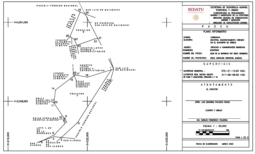 Que, del 25 de septiembre al 4 de octubre de 2023, se realizaron los trabajos técnicos e informativos correspondientes, identificando el territorio que la Comunidad de Mogótavo reconoce como suyo, en el que se encuentra inmersa una fracción del predio denominado "Mesa de la Barranca hoy Cinco Hermanos", ubicada en el municipio de Urique, estado de Chihuahua, respecto del cual fue elaborado el plano informativo obteniéndose como resultado una superficie de 317-88-89.82 hectáreas (trecientas diecisiete hectáreas, ochenta y ocho áreas, ochenta y nueve centiáreas y ochenta y dos miliáreas) compuesta por los polígonos "A" y "B" que se describen en el plano informativo que más adelante se señala, misma que fue susceptible de adquisición por el PADCA;