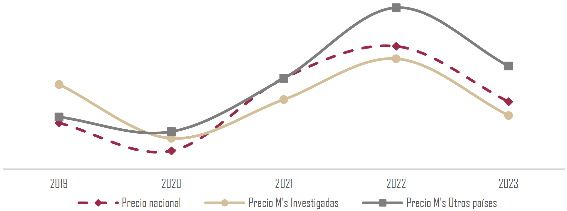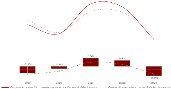210. A partir del comportamiento de los ingresos por ventas y de los costos de operación de la mercancía similar, la Secretaría observó una disminución de 73% en la pérdida operativa en 2020, para convertirse después en beneficio operativo en 2021, al incrementar 724%. Sin embargo, este resultado operativo disminuyó 30% en 2022 y regresó a pérdida operativa en 2023 al disminuir 179%. En este sentido, durante el periodo analizado la pérdida operativa disminuyó 7%.