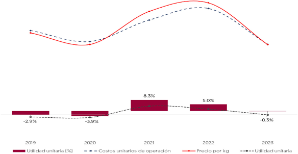214. En resumen, la Secretaría observó que en el periodo de examen y de la revisión, los precios promedio nacionales disminuyeron en mayor medida que la caída que tuvieron los costos operativos de la rama de producción nacional, lo que significó que la utilidad operativa unitaria disminuyera hasta convertirse en pérdida por unidad, tal como se observa en la siguiente gráfica:
