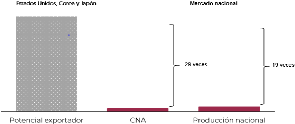 a. El potencial exportador (capacidad instalada menos consumo) disminuyó 27% entre 2019 y 2023, al pasar de 751 mil toneladas en 2019 a 546 mil en 2023. No obstante, este último volumen fue equivalente a más de 29 y 19 veces el tamaño del CNA y de la producción nacional en el periodo de examen y de la revisión, respectivamente.
