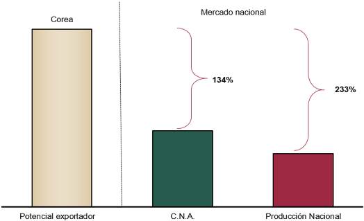 e. Corea dispone de un potencial de exportación de lámina rolada en frío significativamente mayor al mercado y producción nacionales. En particular, el potencial exportador en el periodo de examen y de revisión fue superior en 134% respecto del mercado nacional y 233% respecto de la producción nacional.